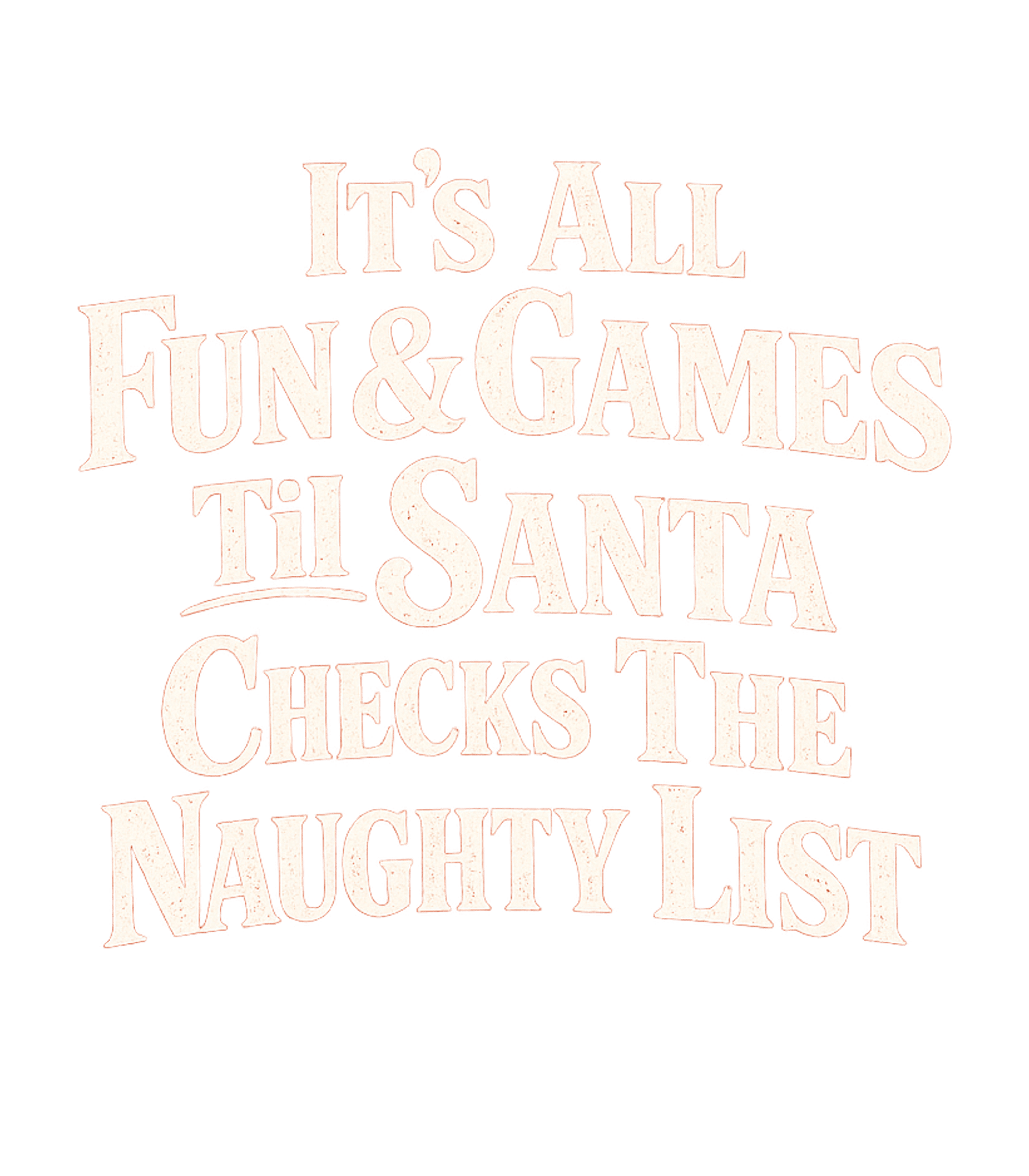 The artwork uses a rustic, distressed typeface with a slight shadow effect, giving it a vintage, cozy, yet bold appeal. The light, off-white color against a white background creates a subtle, understated look, while the textured letters add character. The mood is lighthearted and playfully mischievous, embodying classic holiday charm with a witty twist.