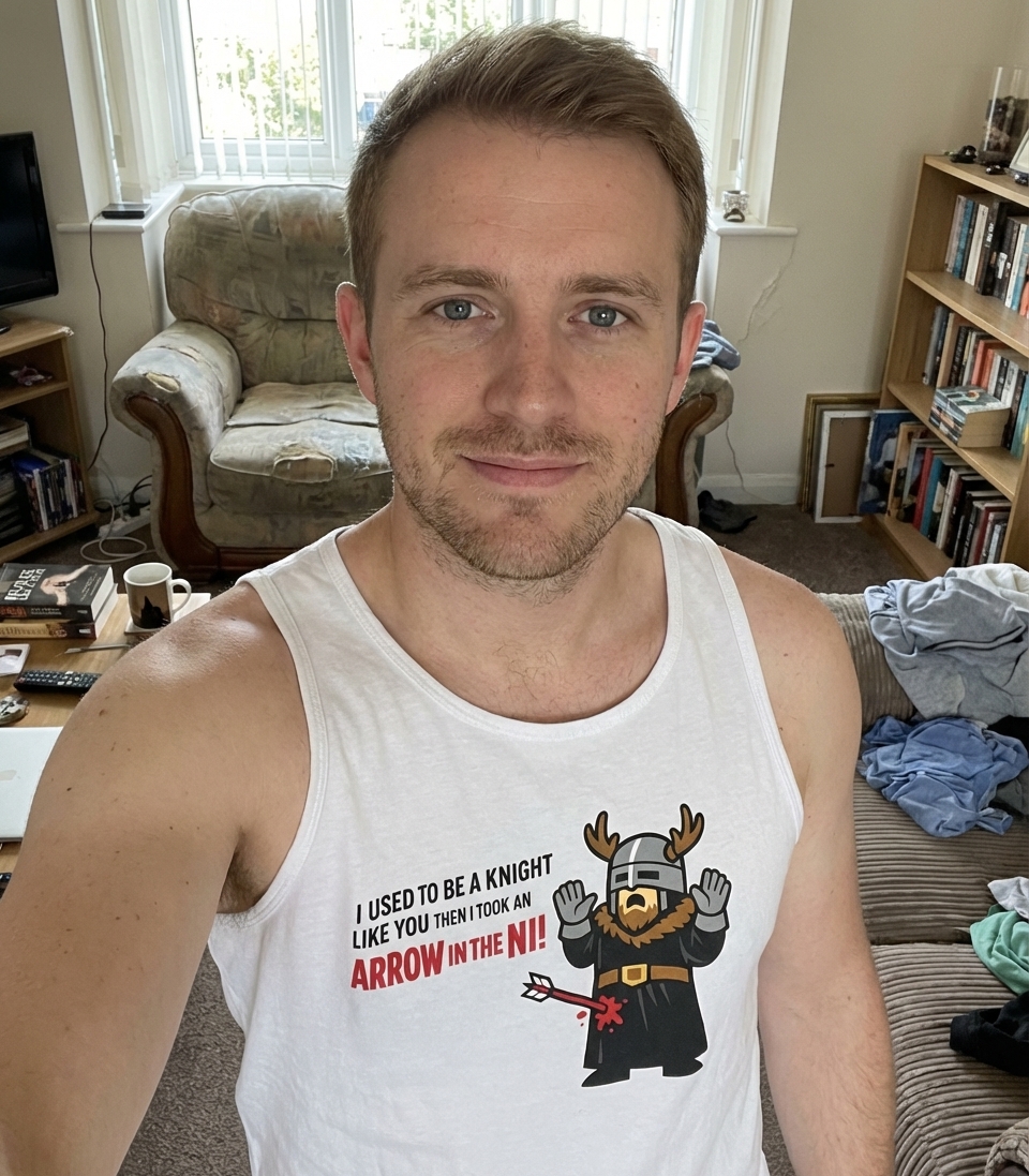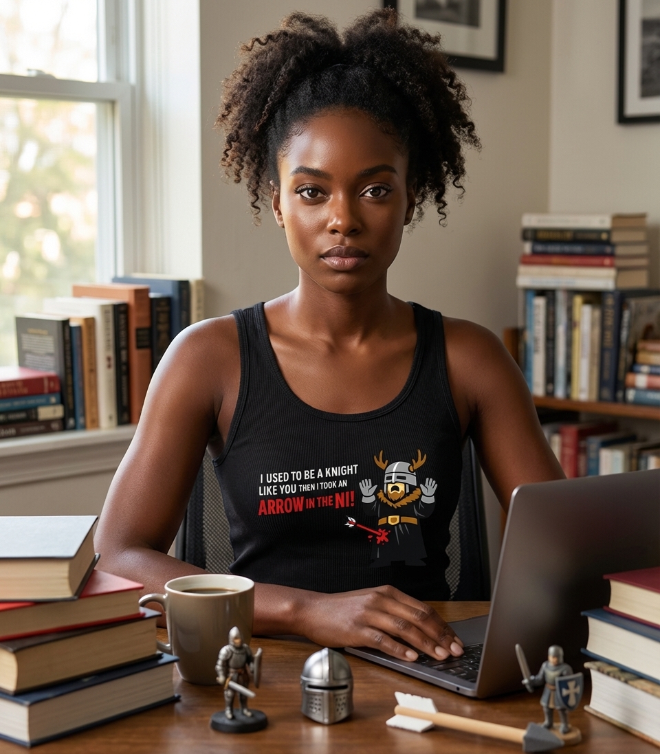 The phrase "I used to be a knight like you, then I took an arrow in the Ni!" is a witty mashup. It cleverly combines the famous "arrow to the knee" line from the video game Skyrim, implying an end to adventuring, with a direct reference to the absurd "Knights Who Say Ni!" from the classic comedy film Monty Python and the Holy Grail.