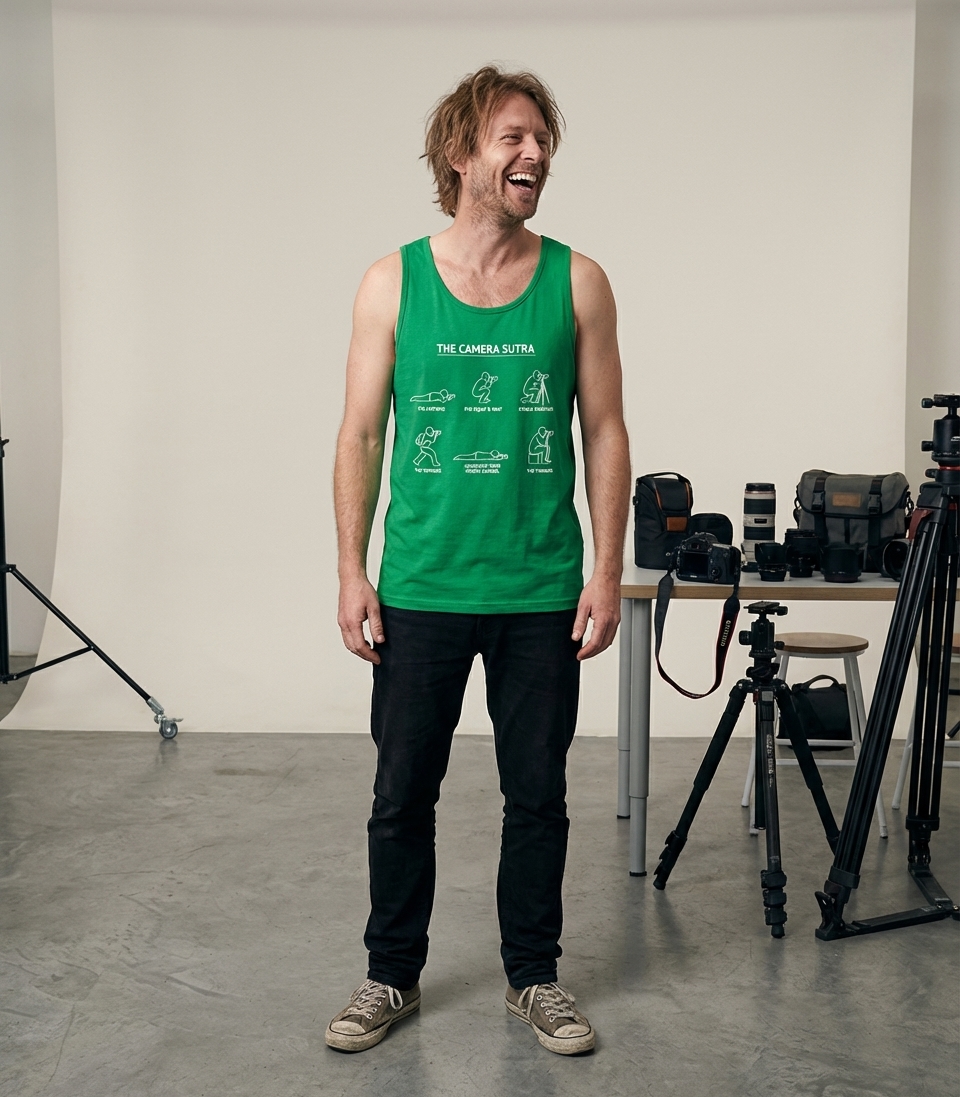 The "Camera Sutra" phrase captures the lifestyle of passionate photographers who spend their days capturing unique angles, finding perfect light, and always getting the shot.