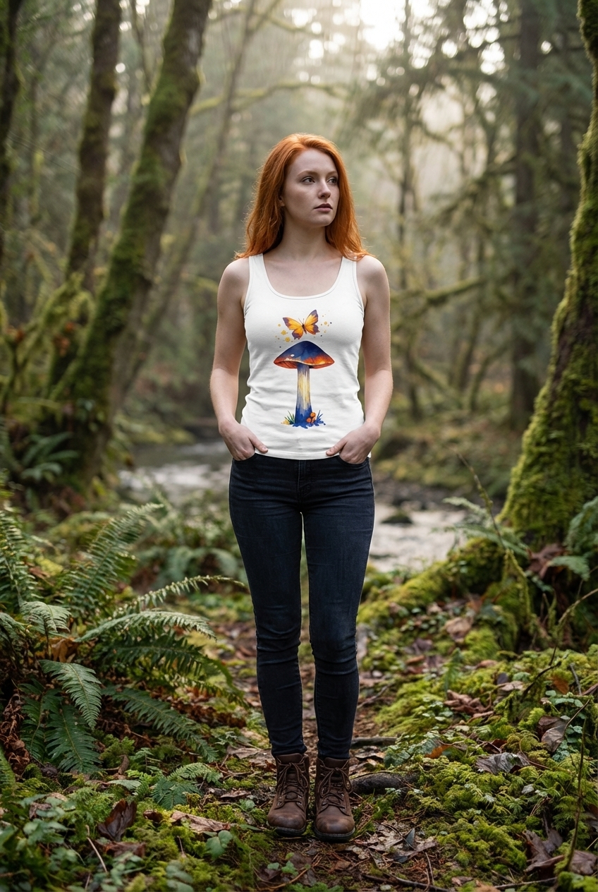 This t-shirt is ideal for nature enthusiasts, fans of fantasy and whimsical art, mushroom and butterfly lovers, and anyone who appreciates unique, artistic designs inspired by the wild.