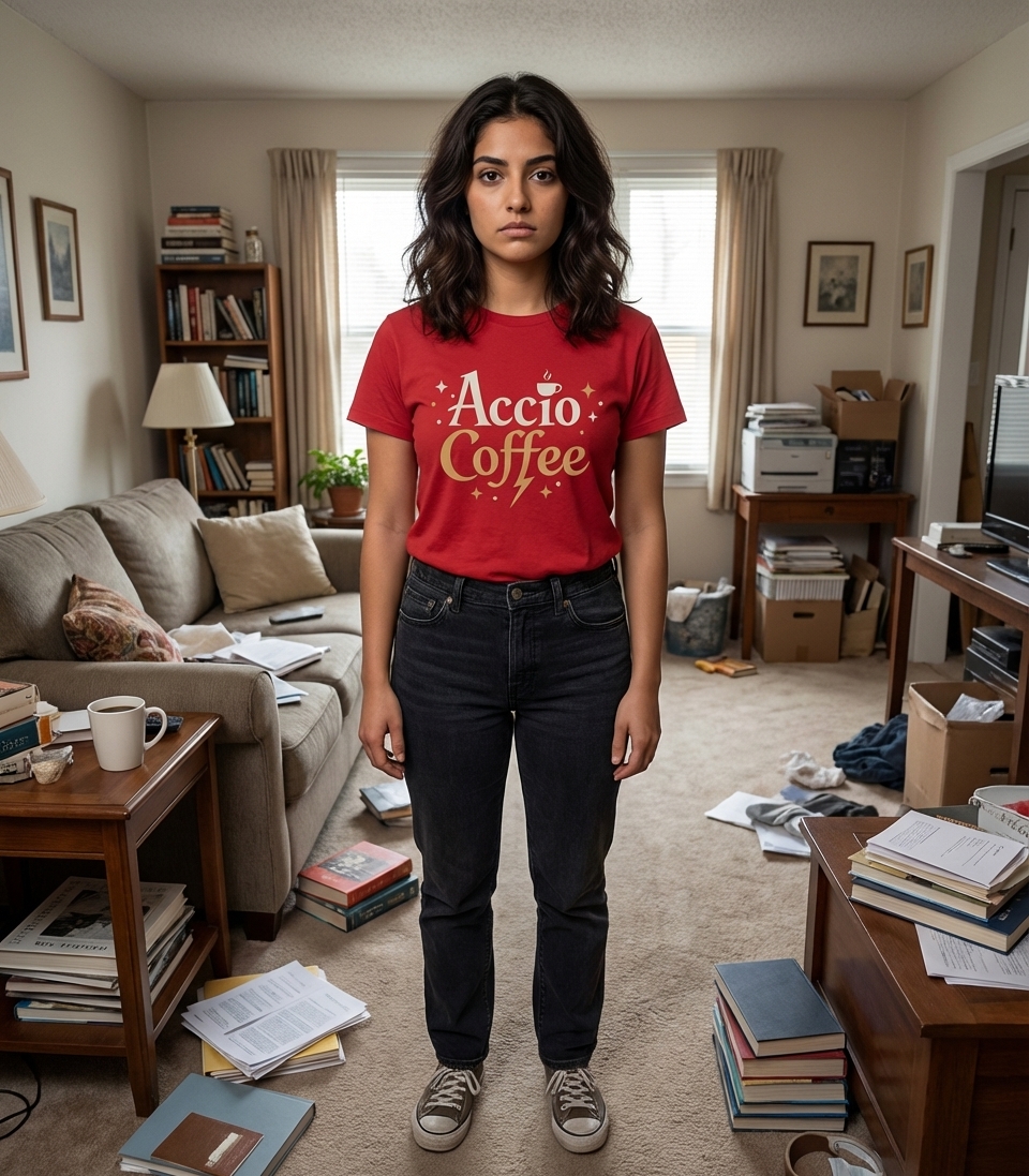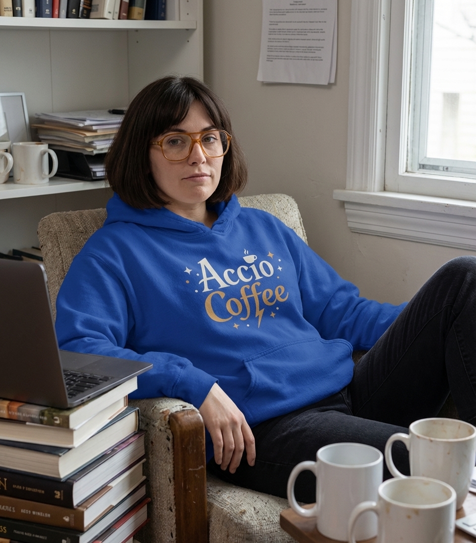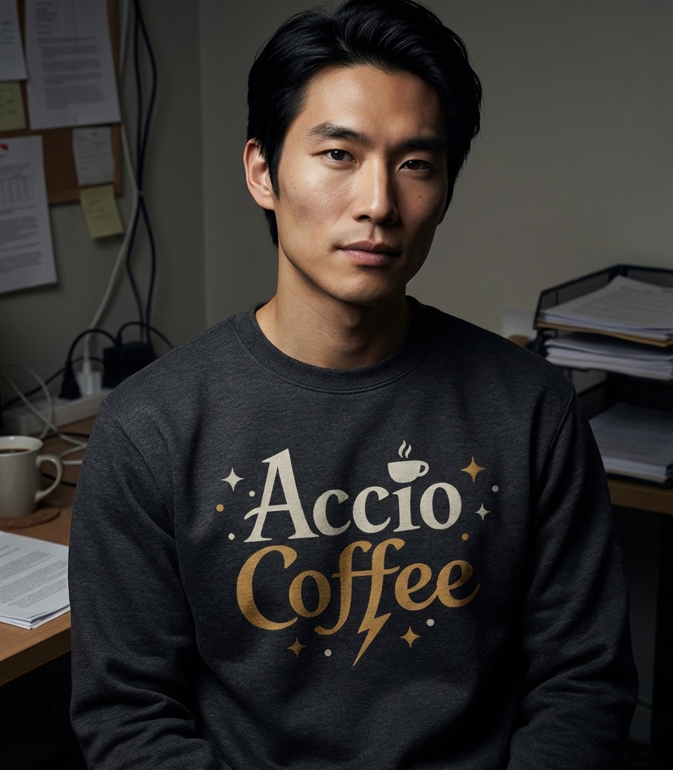 The phrase "Accio Coffee" is a playful twist on a well-known magic spell, "Accio," which is used to summon objects. Here, it humorously expresses the desperate need or desire to magically bring forth a cup of coffee.