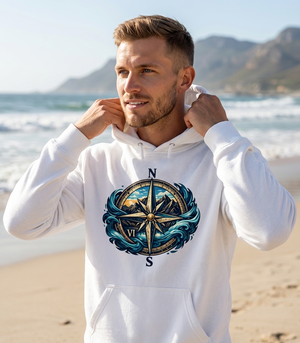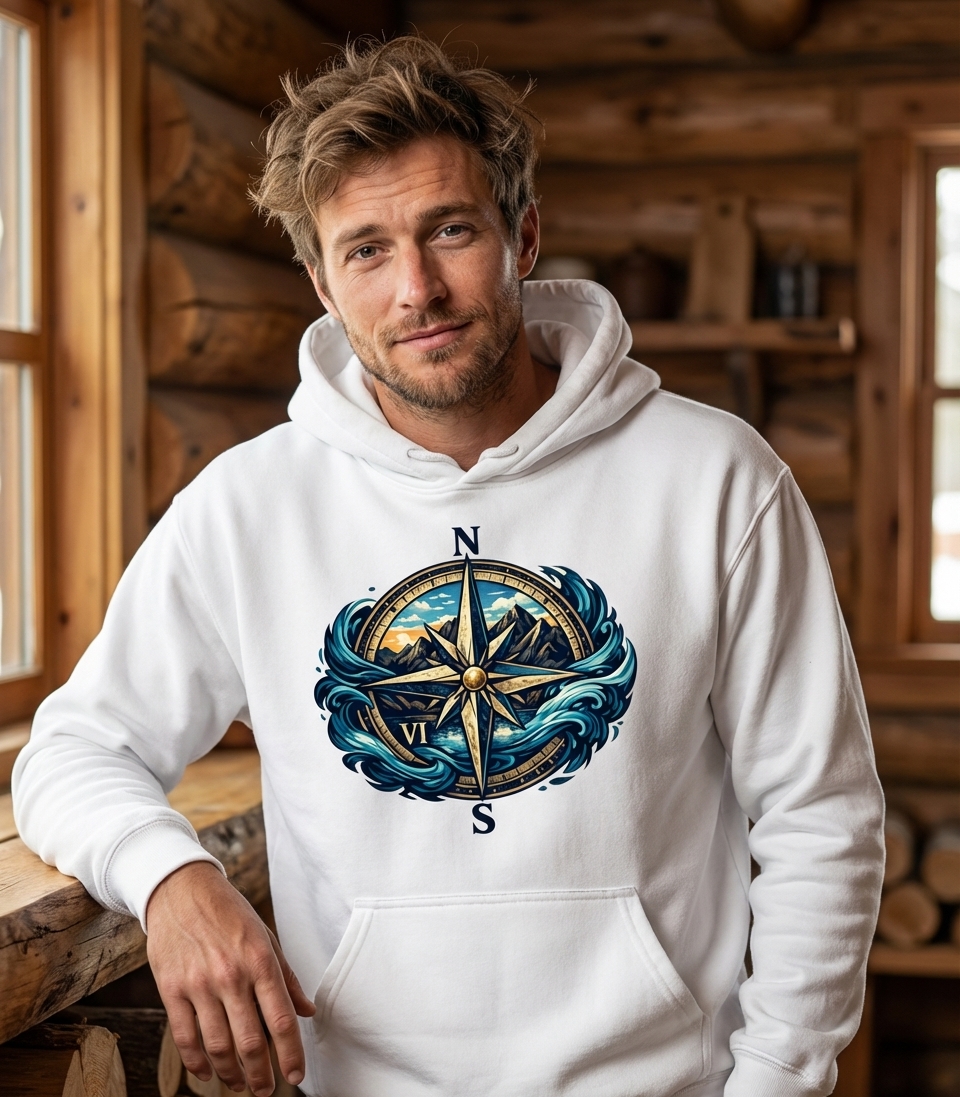 The compass rose design captures the lifestyle of passionate travelers who spend their days exploring mountains, navigating waters, and seeking new horizons.