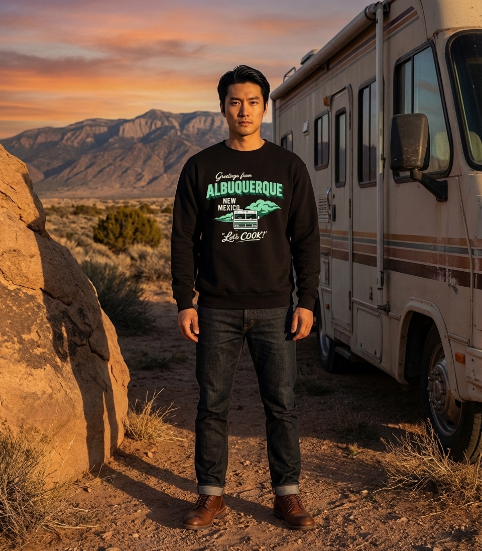 The 'Greetings from Albuquerque, Let's COOK!' design captures the lifestyle of passionate TV show fans who appreciate clever pop culture references, unique travel aesthetics, and memorable iconic vehicles.