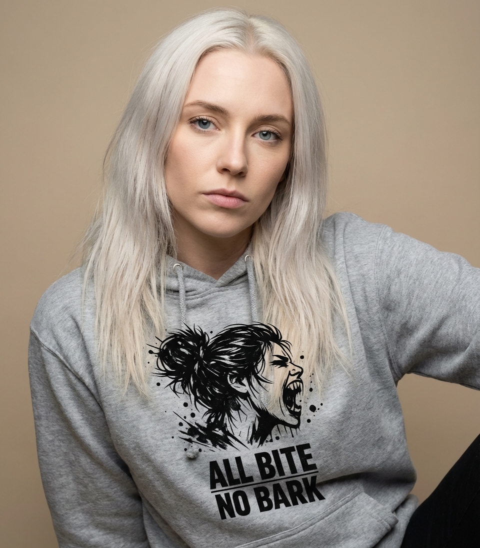 The "All Bite No Bark" phrase captures the lifestyle of assertive individuals who prioritize action, speak their mind, and refuse to back down.