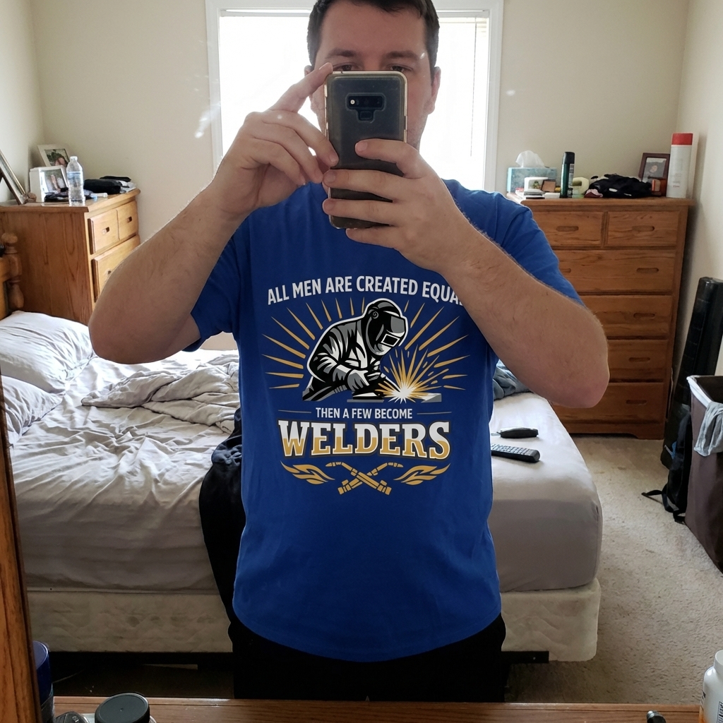 got this 'all men become welders' tee and it's seriously so comfy, like, surprisingly good quality for the price. the print is solid and the joke's just spot on, makes me smile every time I wear it.
