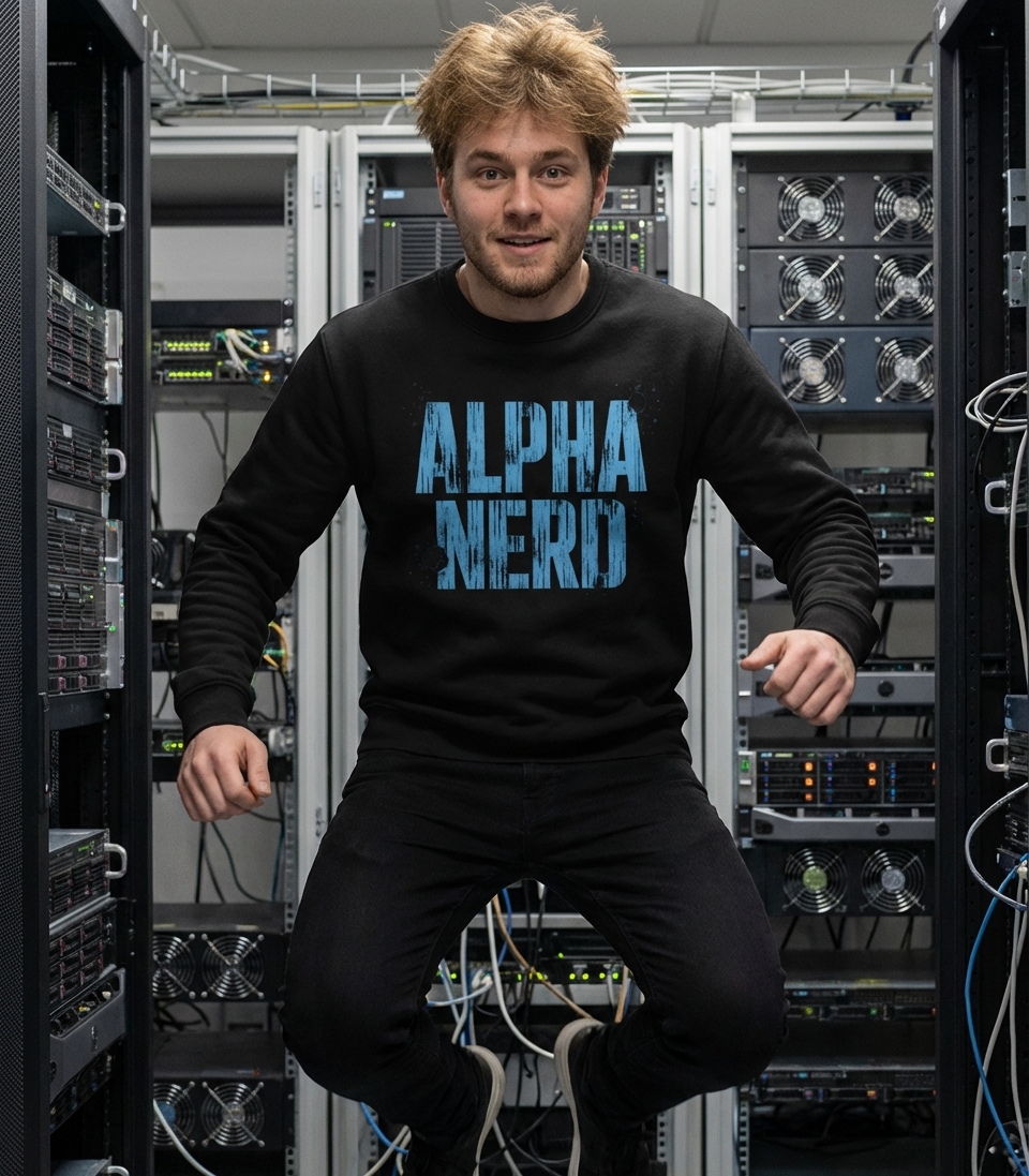The "Alpha Nerd" phrase captures the lifestyle of confident intellectuals who embrace their passion for coding, gaming, and obscure knowledge.