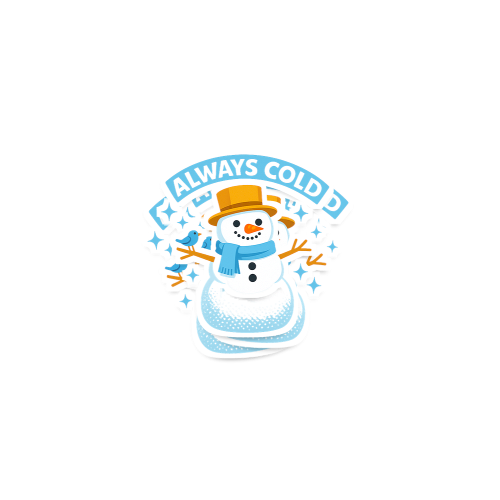 The artwork uses a flat graphic style with bright, inviting colors, predominantly light blue, white, and orange against a dark background. The typography for 'ALWAYS COLD' is a friendly, rounded sans-serif font, arced above a cheerful snowman. The overall mood is whimsical and lighthearted, evoking the joy and slight exaggeration of winter's chill.