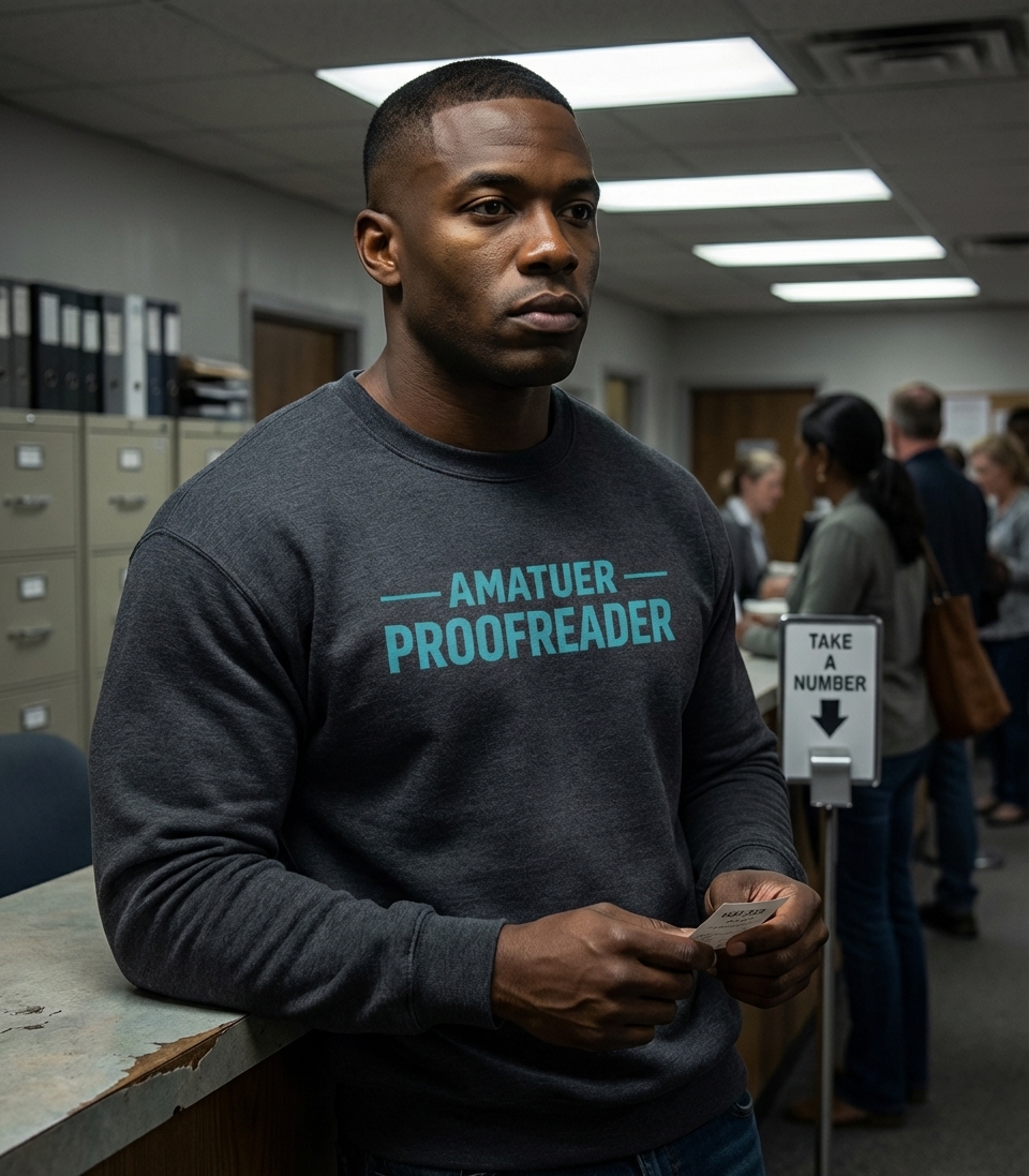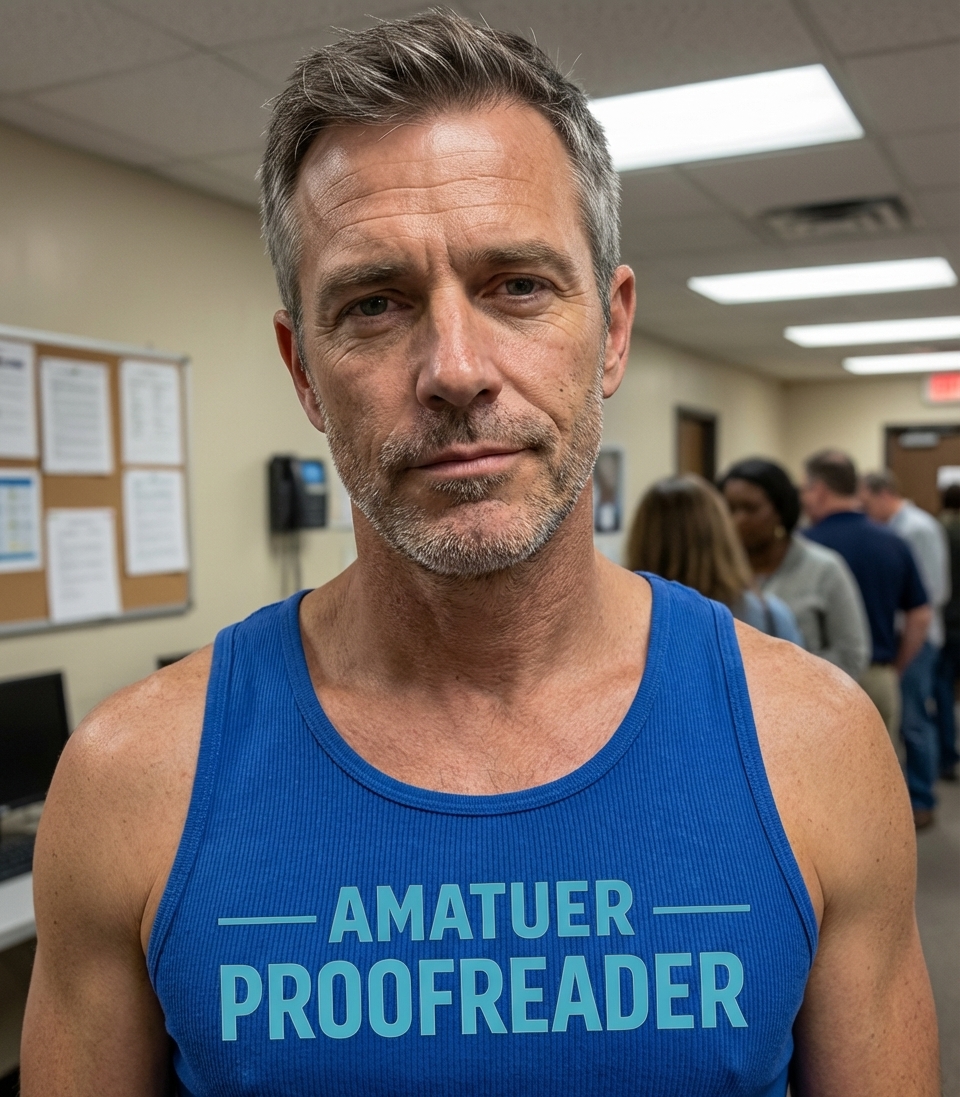 The 'Amatuer Proofreader' phrase captures the ironic humor of meticulous word lovers who often spot errors everywhere but sometimes miss their own.