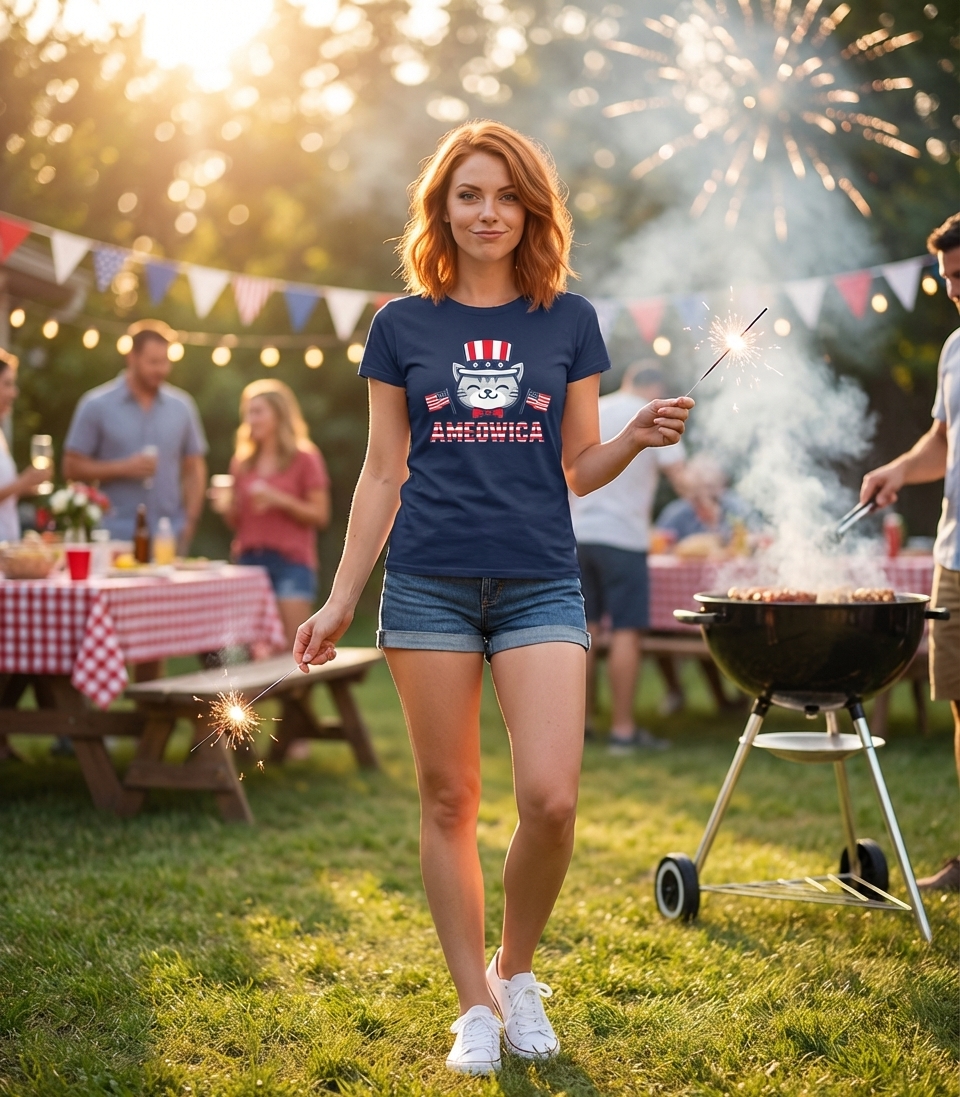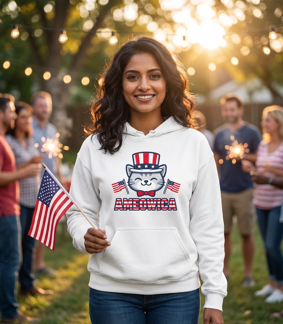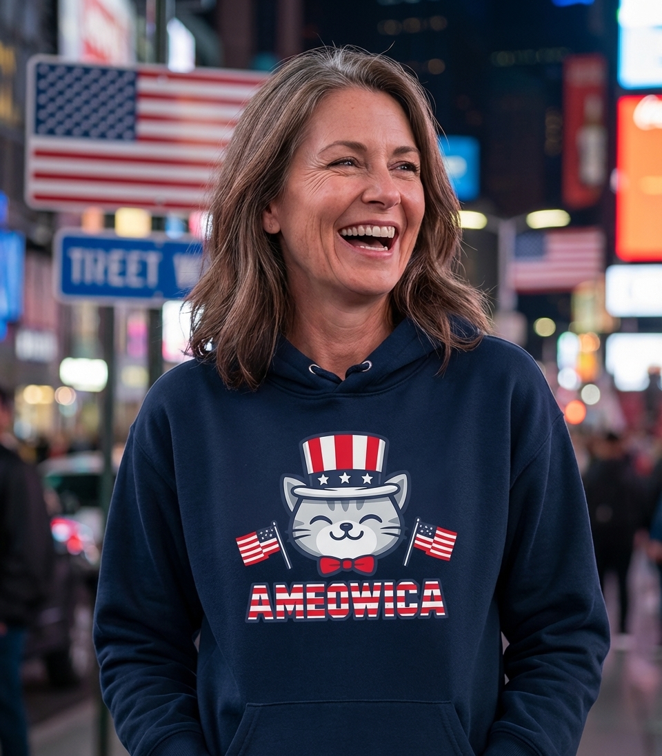 The "Ameowica" phrase captures the lifestyle of proud American cat lovers who celebrate independence, enjoy witty puns, and share their feline patriotism.