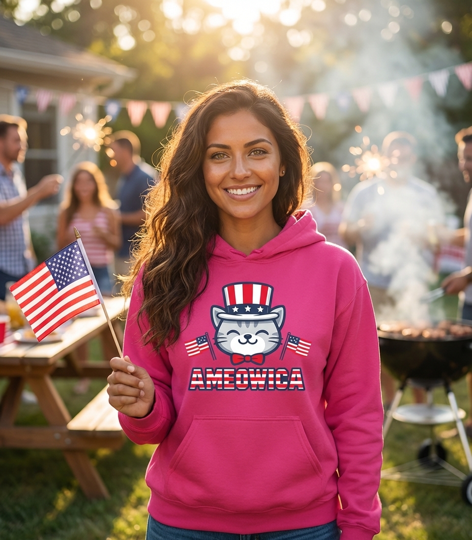 The phrase "Ameowica" is a clever and humorous pun combining "America" with "meow," the distinctive sound a cat makes. It symbolizes a playful expression of national pride, particularly appealing to cat lovers.