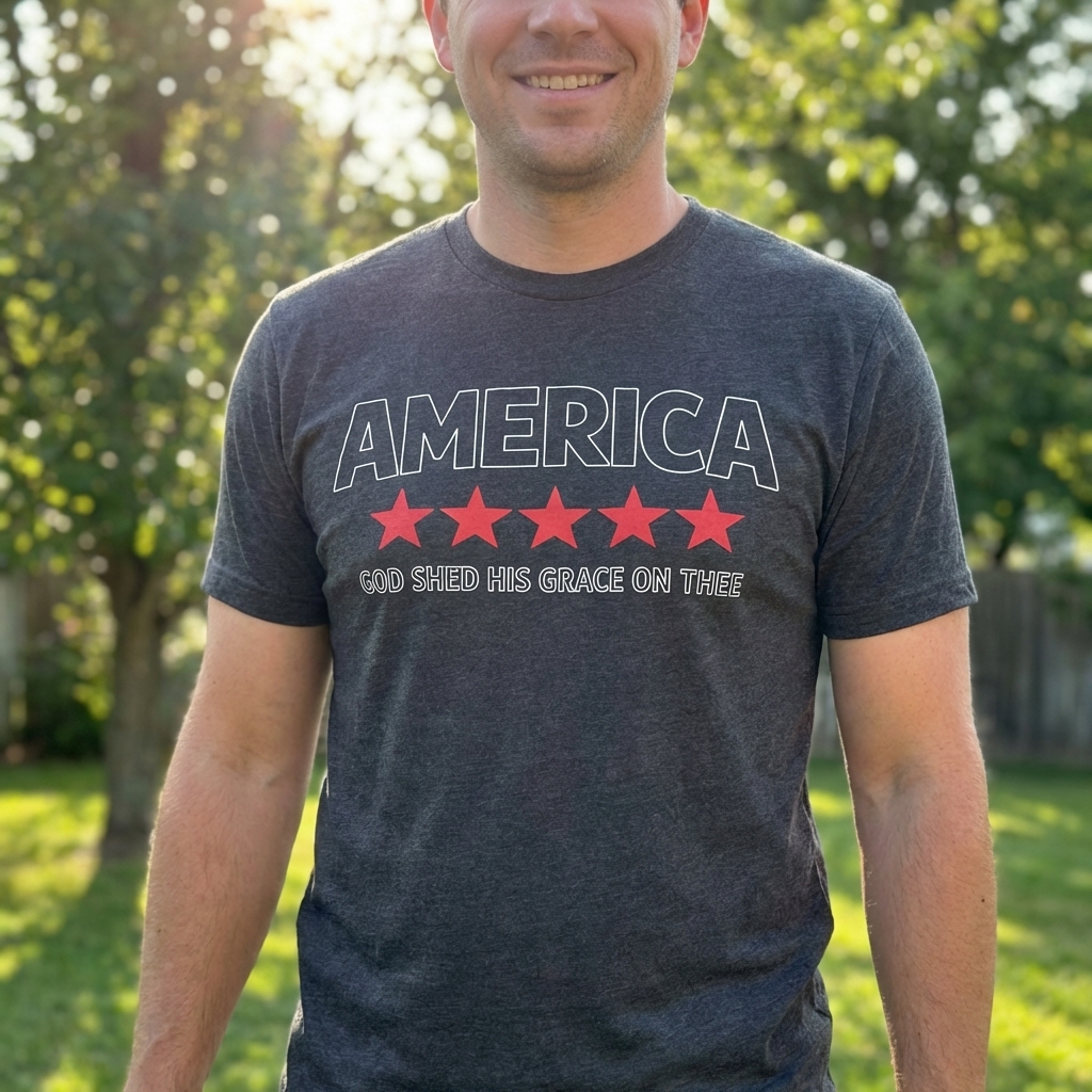 This powerful design features the word "AMERICA" prominently, underscored by five bold red stars. Below, the classic line "GOD SHED HIS GRACE ON THEE" is displayed, invoking a sense of divine blessing and national pride.