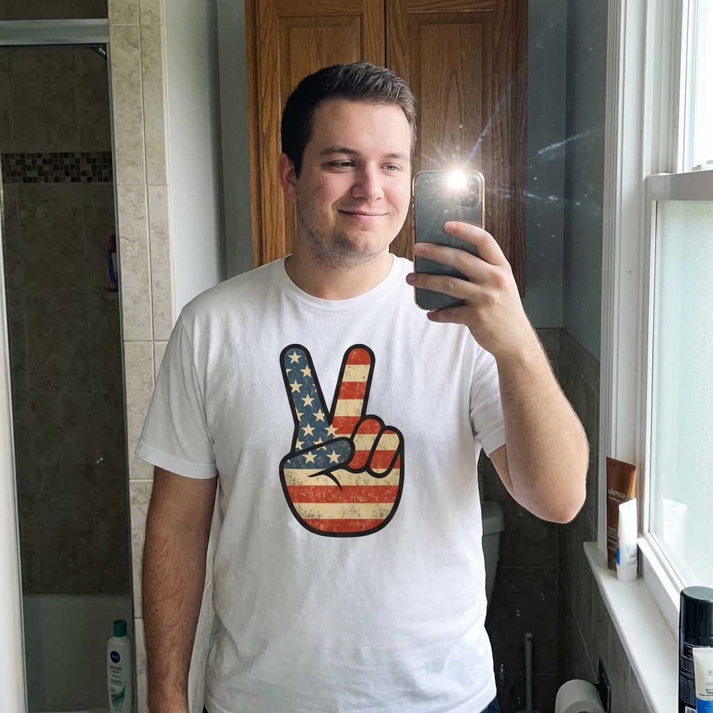 just got this shirt and wow, it's actually really soft. the american flag peace sign design is super cool and looks great without being too loud. comfy and stylish, totally recommend.