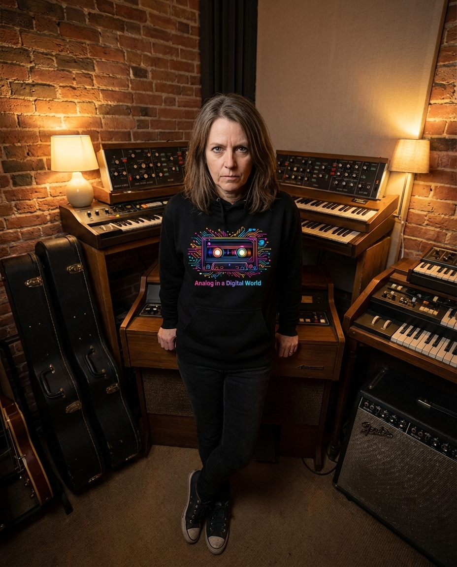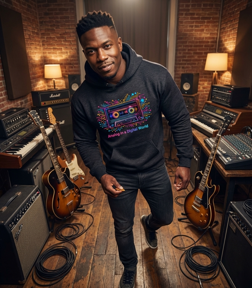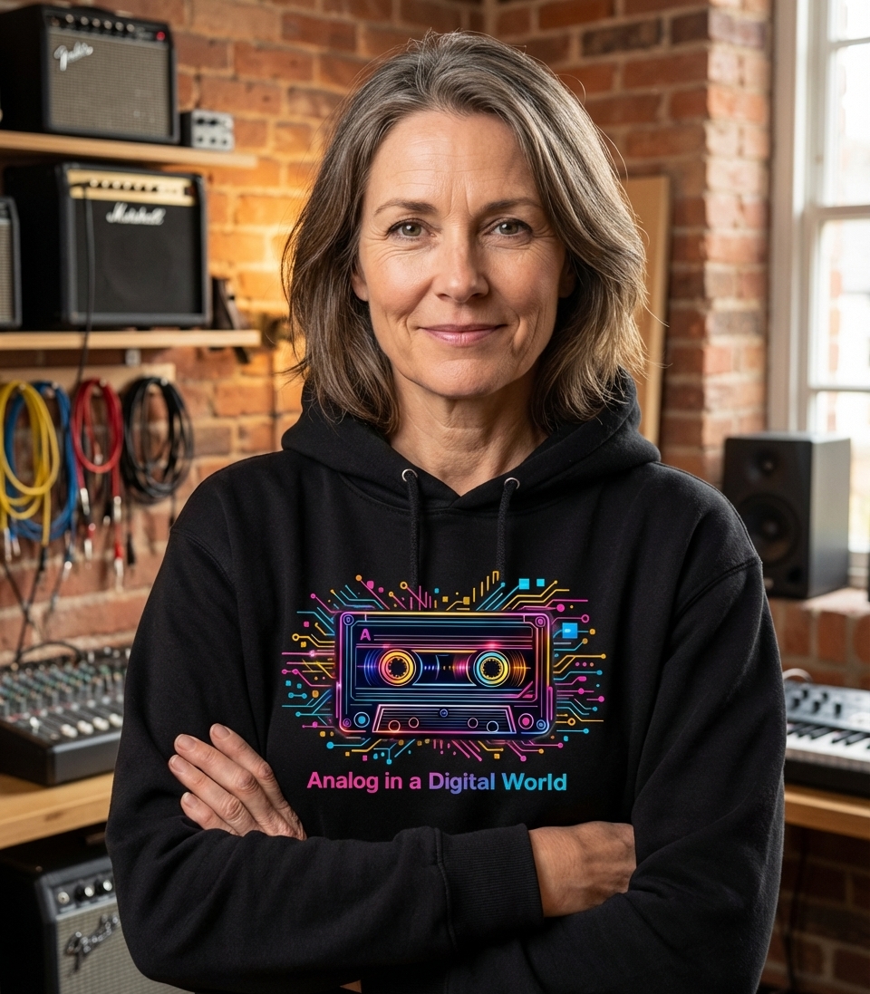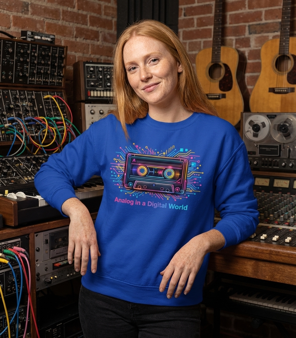 The 'Analog in a Digital World' phrase captures the lifestyle of nostalgic tech enthusiasts who appreciate retro aesthetics, classic audio formats, and the vibrant culture of the 80s and 90s.
