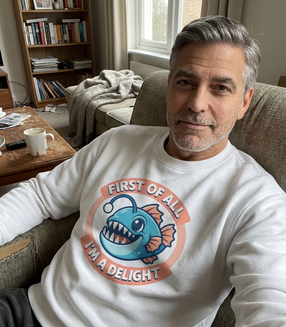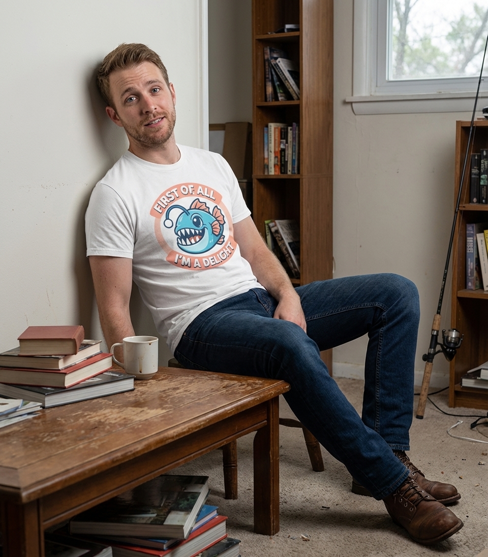 This humorous graphic features a charming anglerfish, typically known for its intimidating deep-sea appearance, smiling brightly with its characteristic lure lit up. The design subverts expectations by pairing this creature with a playfully self-assured statement.