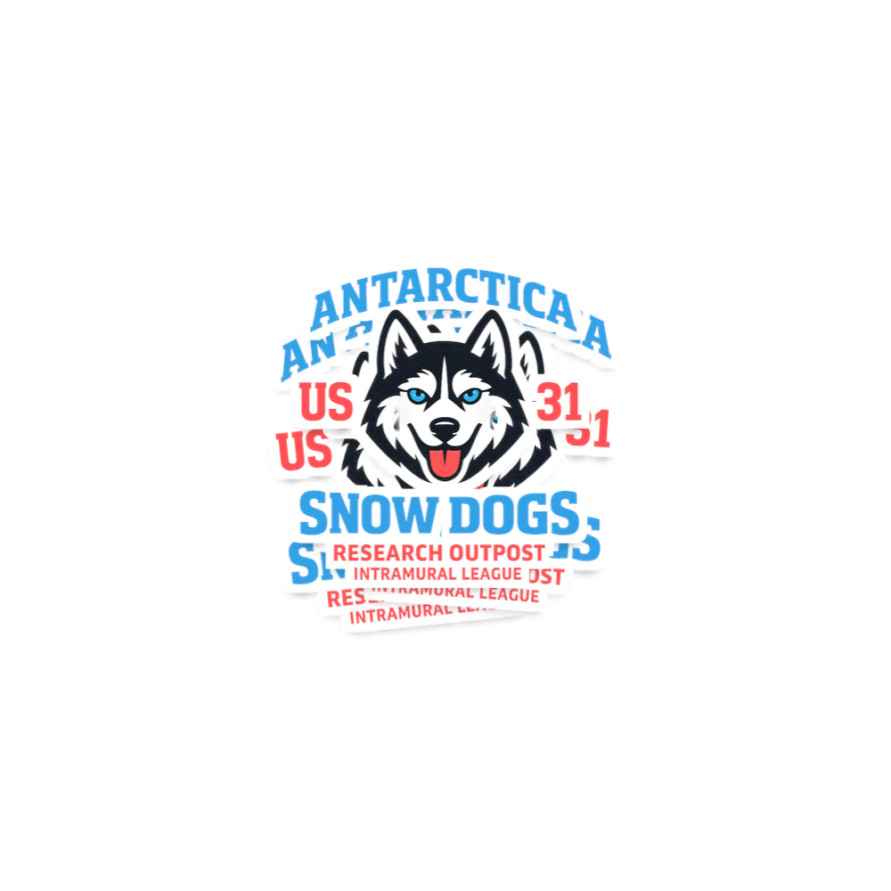 This design features a striking graphic of a husky, representing the "Antarctica US 31 Snow Dogs" from a research outpost's intramural league. The artwork combines elements of team spirit with the rugged beauty of arctic animals, set against the unique backdrop of Antarctic exploration.