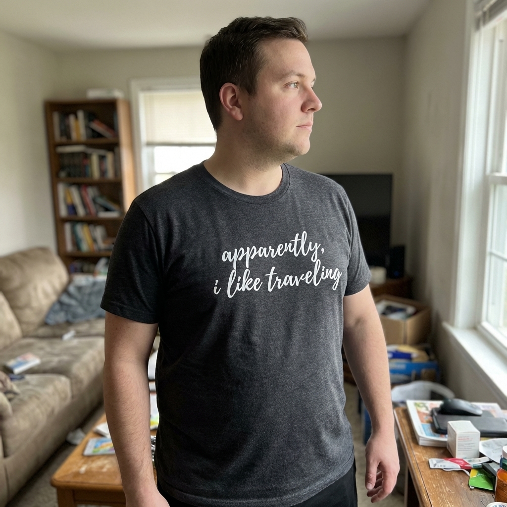 love this new tee! it's incredibly soft, honestly, way better than I expected. And that 'Apparently Traveling Love' design? so unique and cool, perfect for just chilling or out and about. totally recommend!