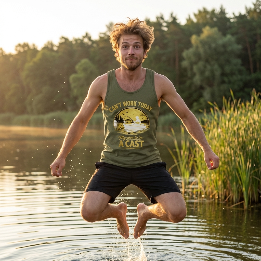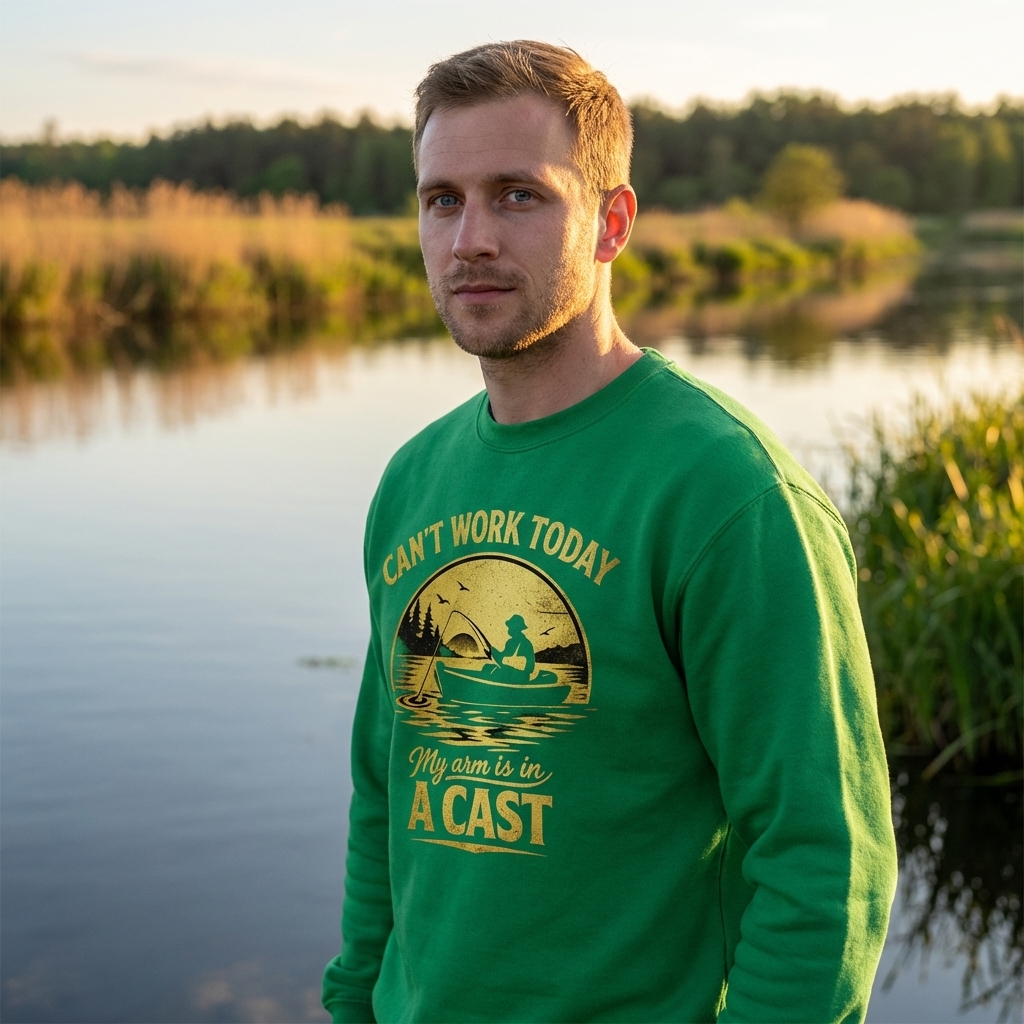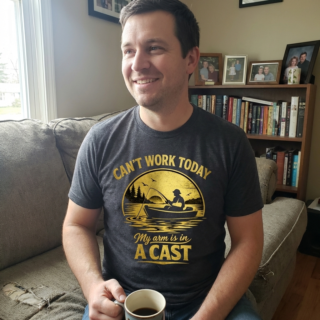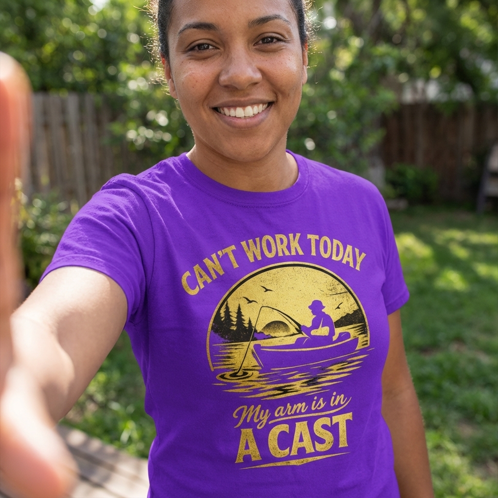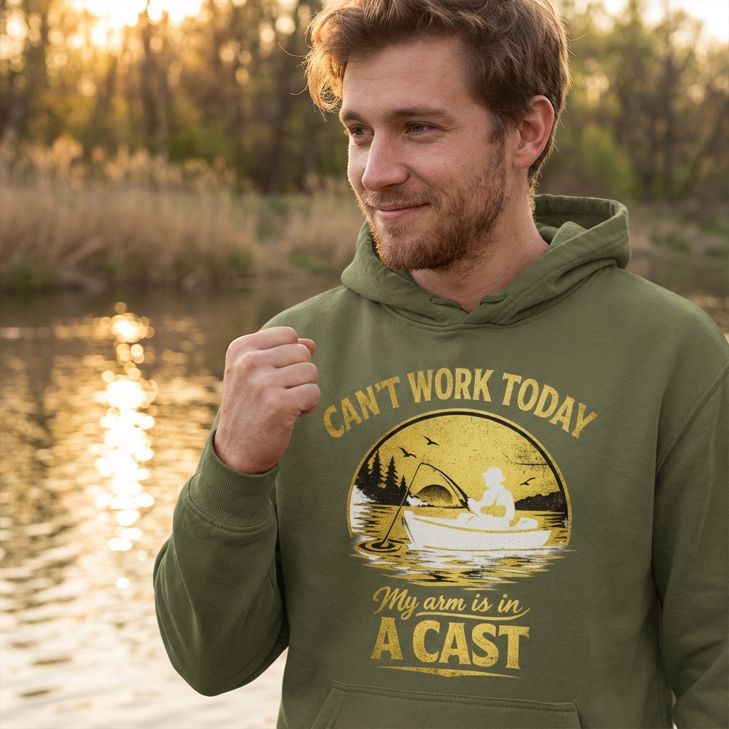 The clever phrase "Can't work today, my arm is in a cast" plays on the double meaning of "cast" – both a medical device for a broken limb and the act of casting a fishing line. It's a humorous excuse for any avid fisherman to skip work and hit the water.