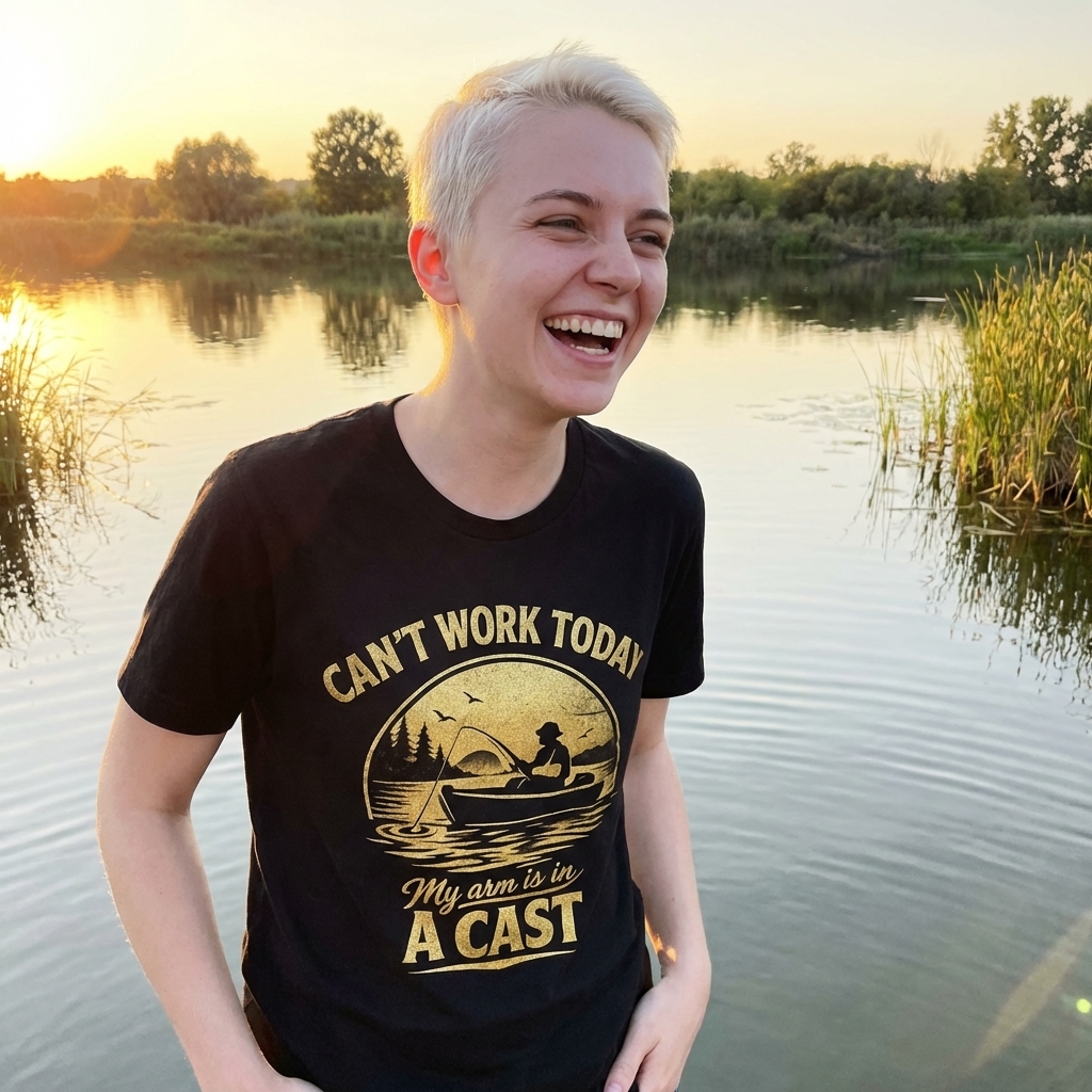 ngl, this 'arm in a cast fishing' tee is even better than i thought it'd be. The design is perfectly quirky without being too much, and the shirt itself is comfy as heck. Really happy with this one.