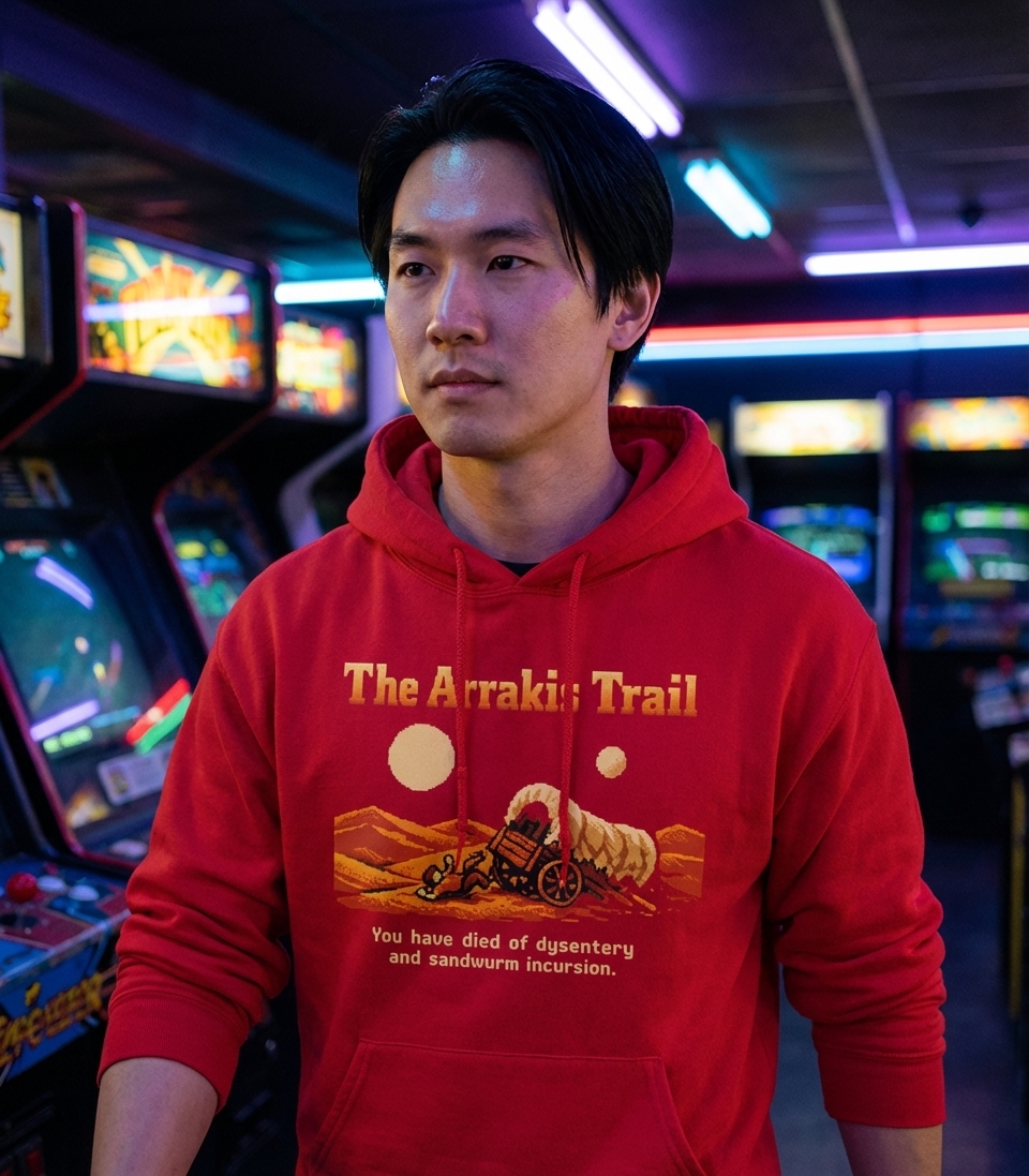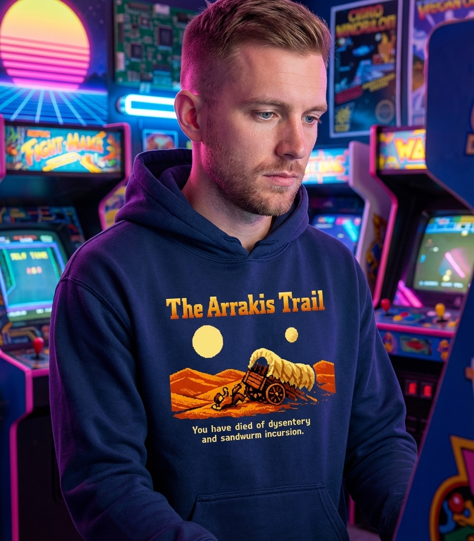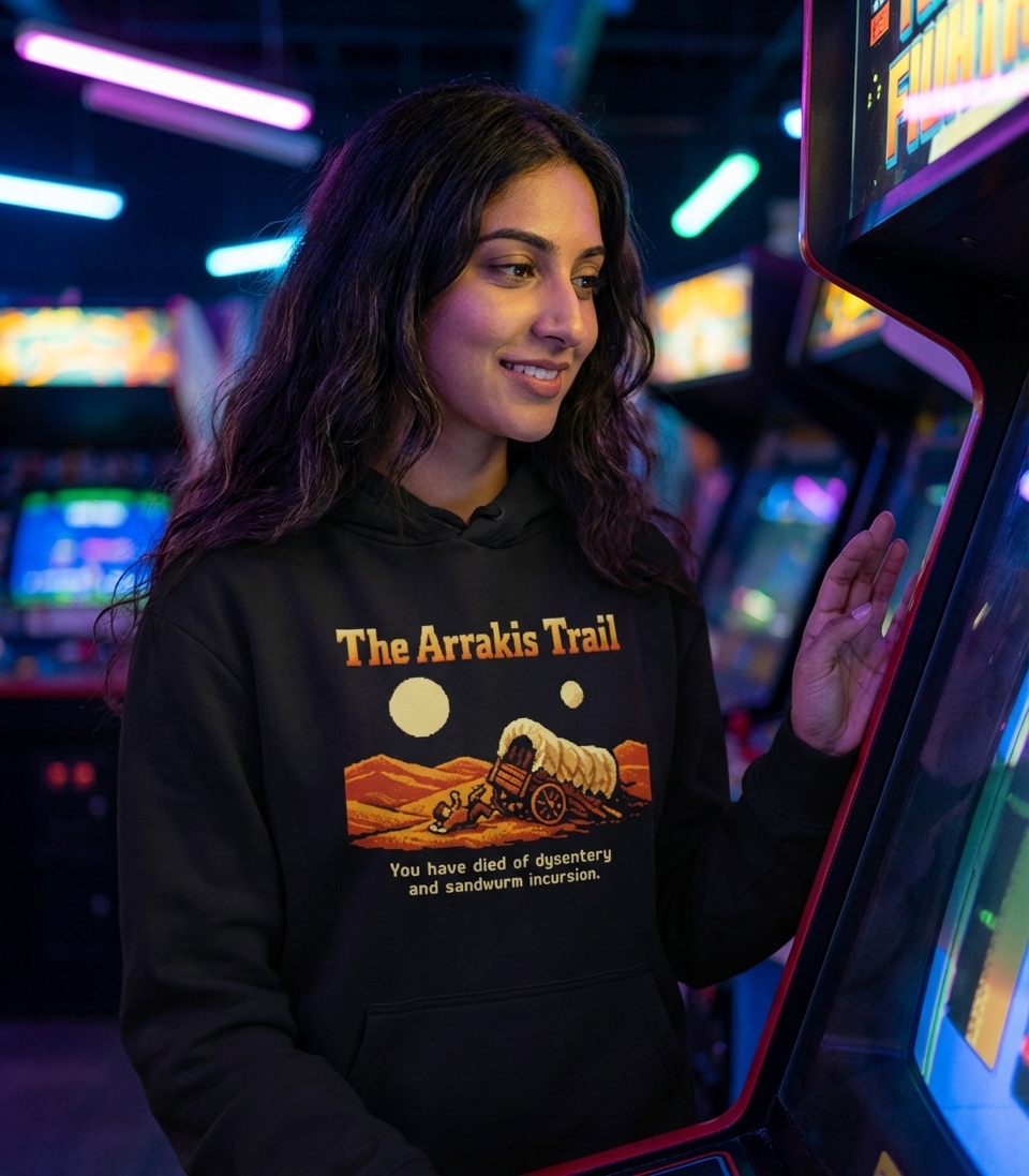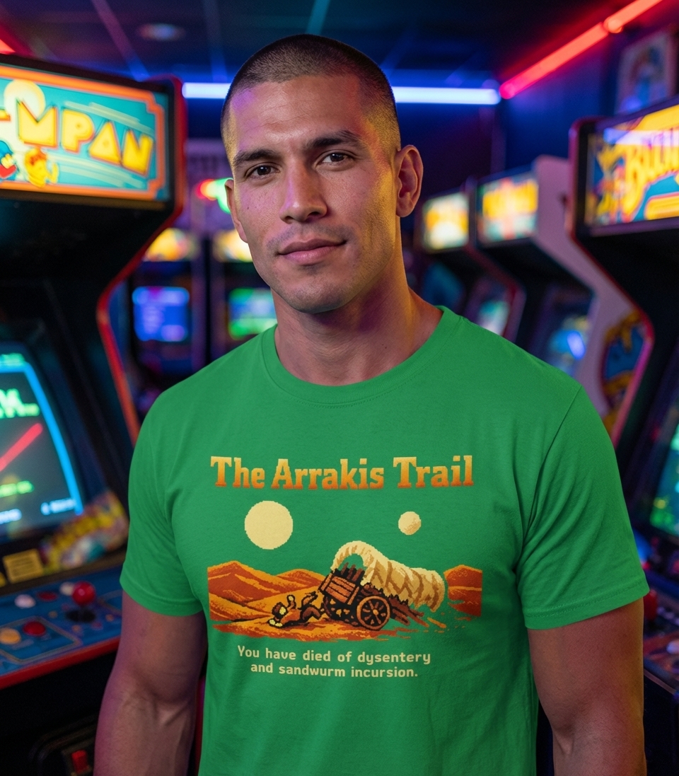 This unique graphic tee features a clever crossover between the classic educational computer game, The Oregon Trail, and the epic science fiction saga, Dune. Rendered in charming 8-bit pixel art, the design depicts a covered wagon stranded in a harsh desert landscape under two suns.
