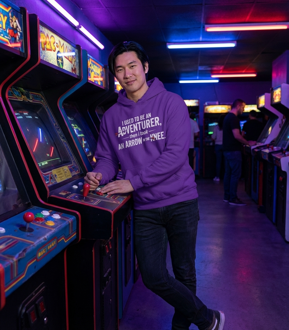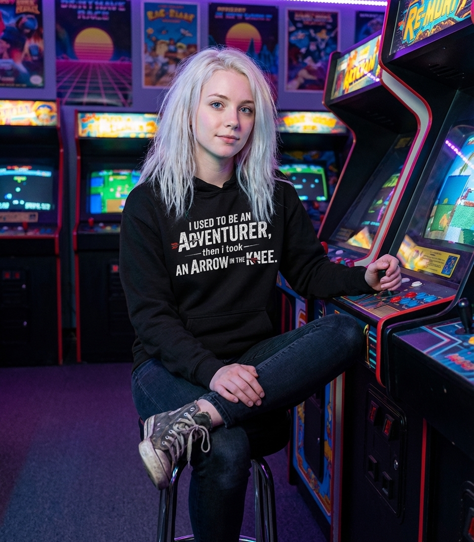 This design features the memorable line "I used to be an adventurer, then I took an arrow in the knee" in a bold, distressed font. Two arrows are incorporated into the text, reinforcing the phrase's visual humor. The black background makes the white text and red arrow fletching stand out.