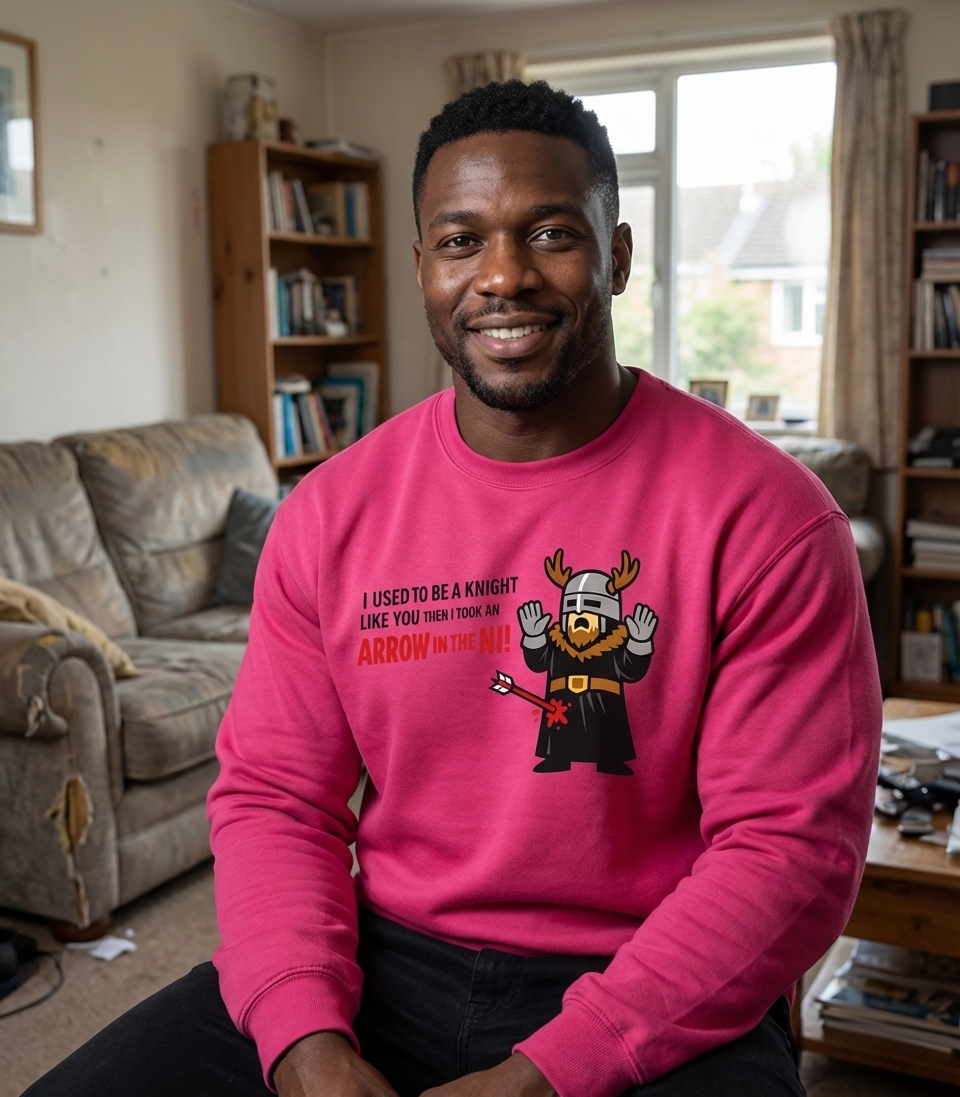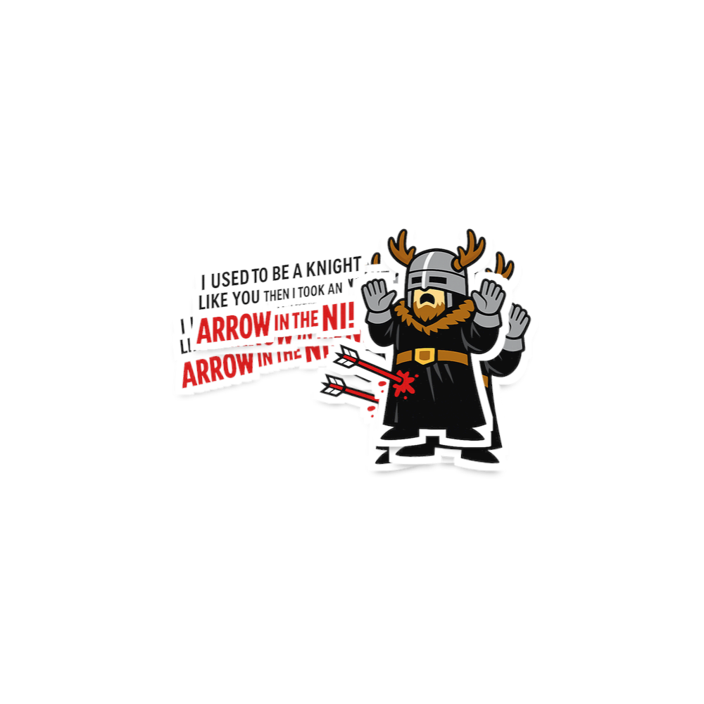 The phrase "I used to be a knight like you, then I took an arrow in the Ni!" is a witty mashup. It cleverly combines the famous "arrow to the knee" line from the video game Skyrim, implying an end to adventuring, with a direct reference to the absurd "Knights Who Say Ni!" from the classic comedy film Monty Python and the Holy Grail.