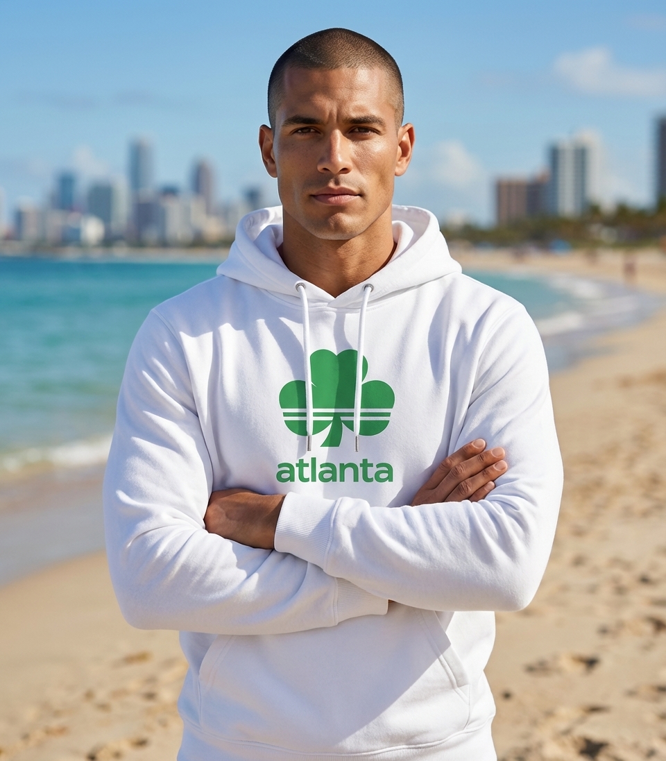 This graphic features a vibrant green shamrock, an iconic symbol of Irish heritage and St. Patrick's Day celebrations. The design is customized with the city name 'Atlanta' in a matching green, creating a localized expression of festive pride. Its classic athletic-inspired style gives it a timeless appeal.