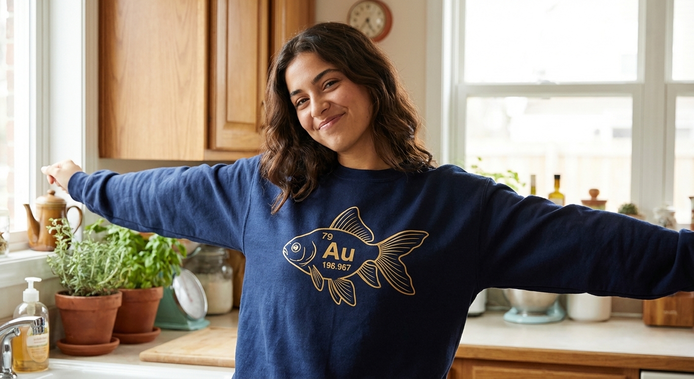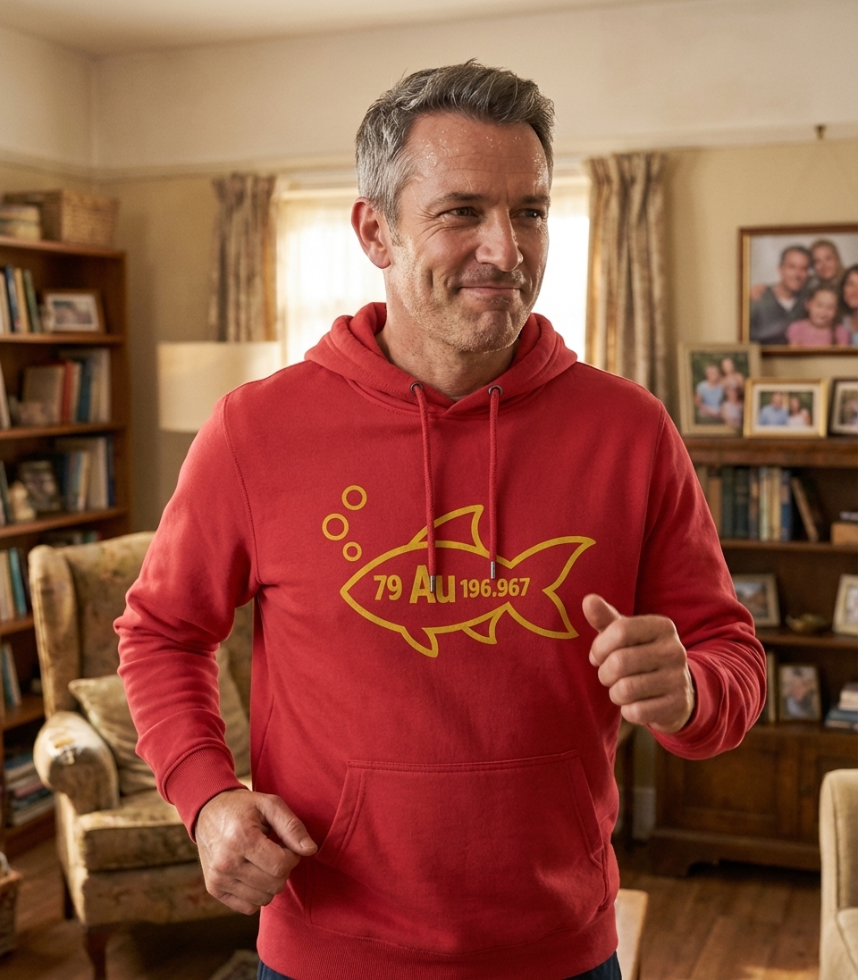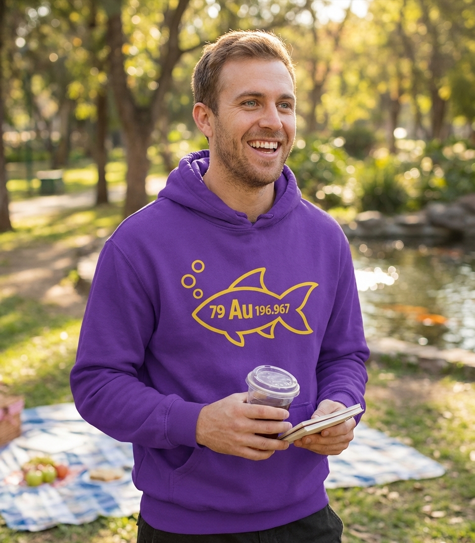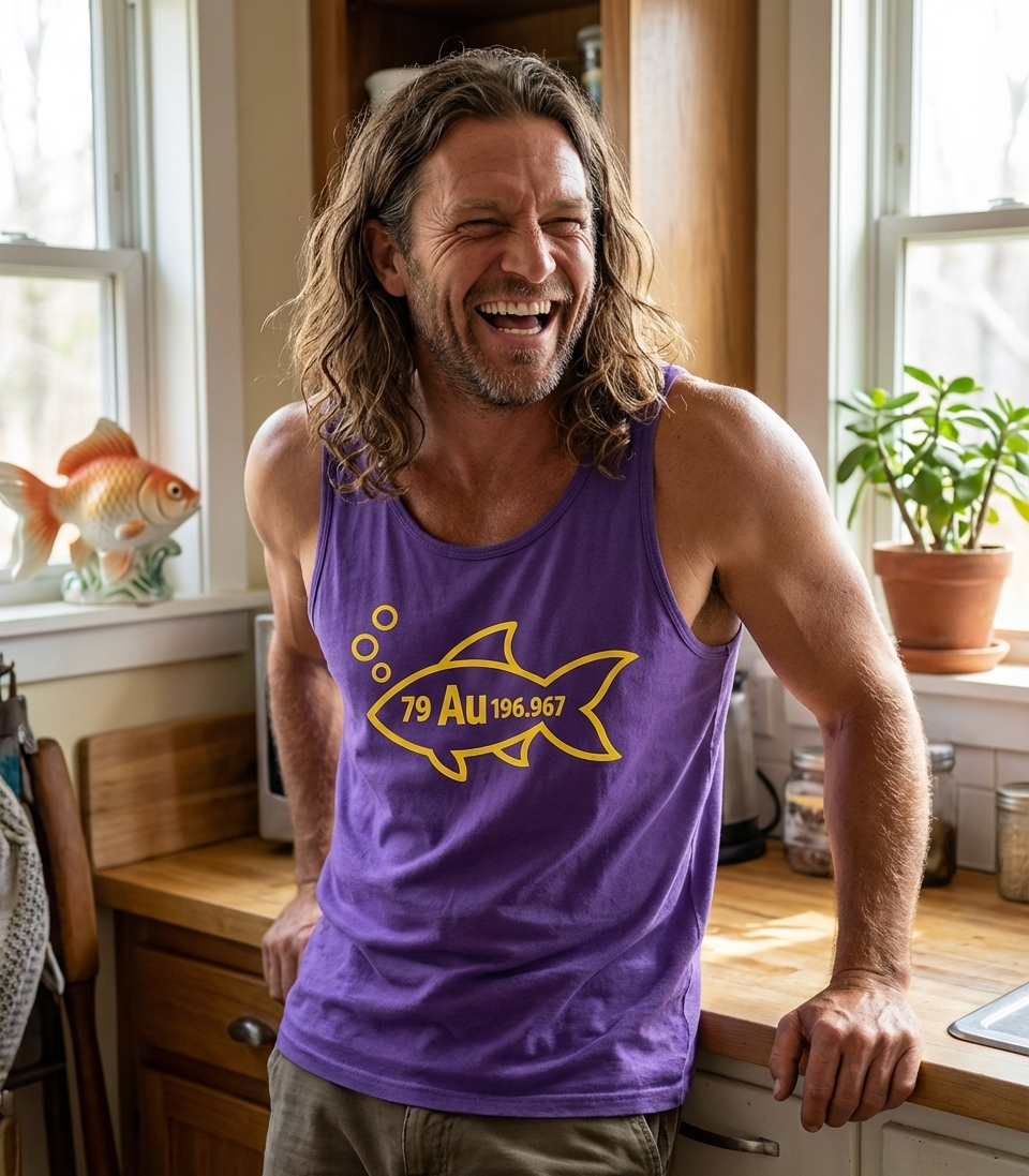 The numbers "79 Au 196.967" represent the element Gold (Au) on the periodic table. When placed inside the fish silhouette, it creates the humorous phrase "gold fish," making it a perfect conversation starter for anyone with a love for science or clever wordplay.