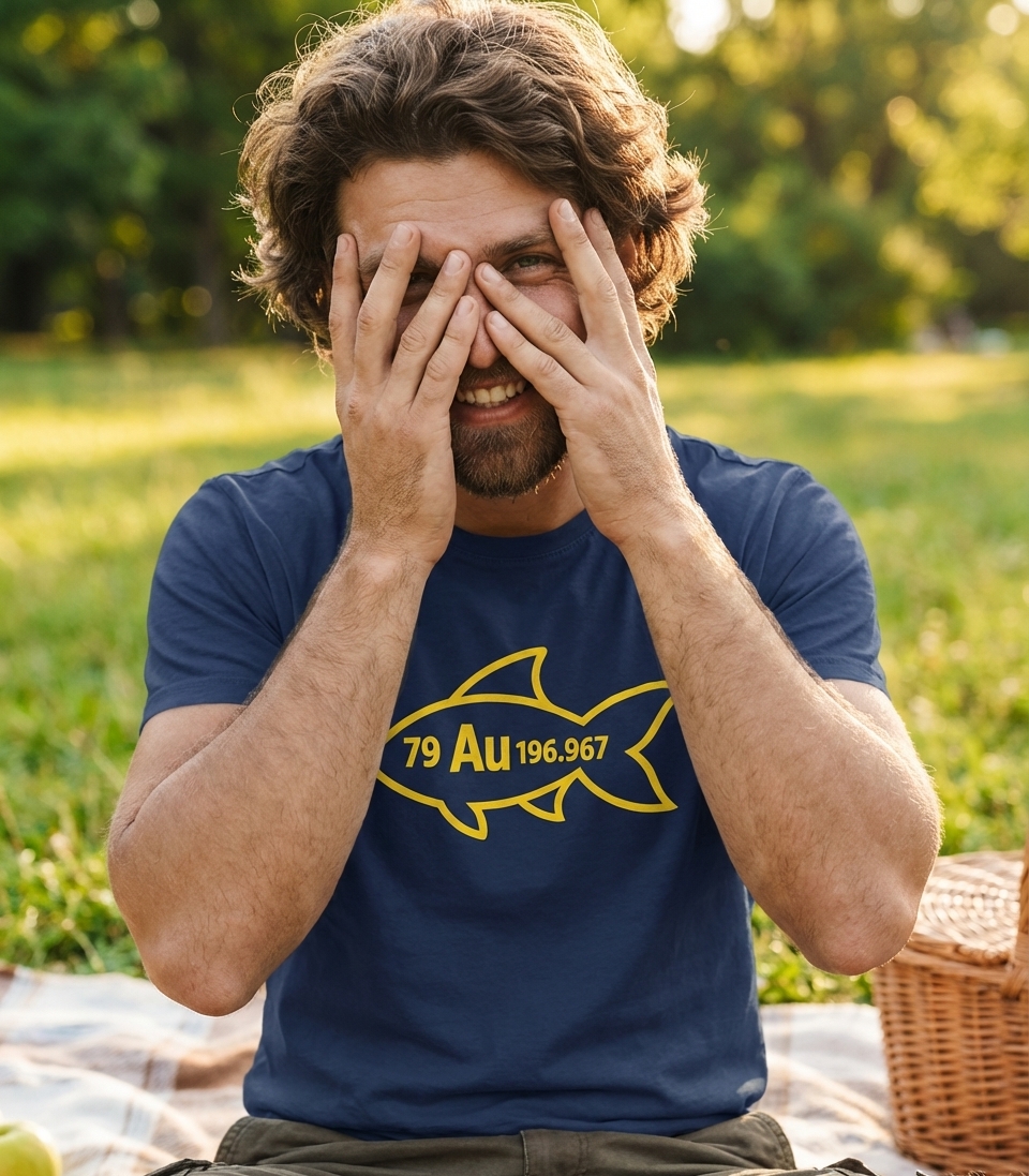This unique t-shirt artwork features a minimalist outline of a fish, ingeniously filled with the chemical symbol, atomic number, and atomic mass for gold. The design is a playful visual pun, combining marine life with fundamental chemistry principles.