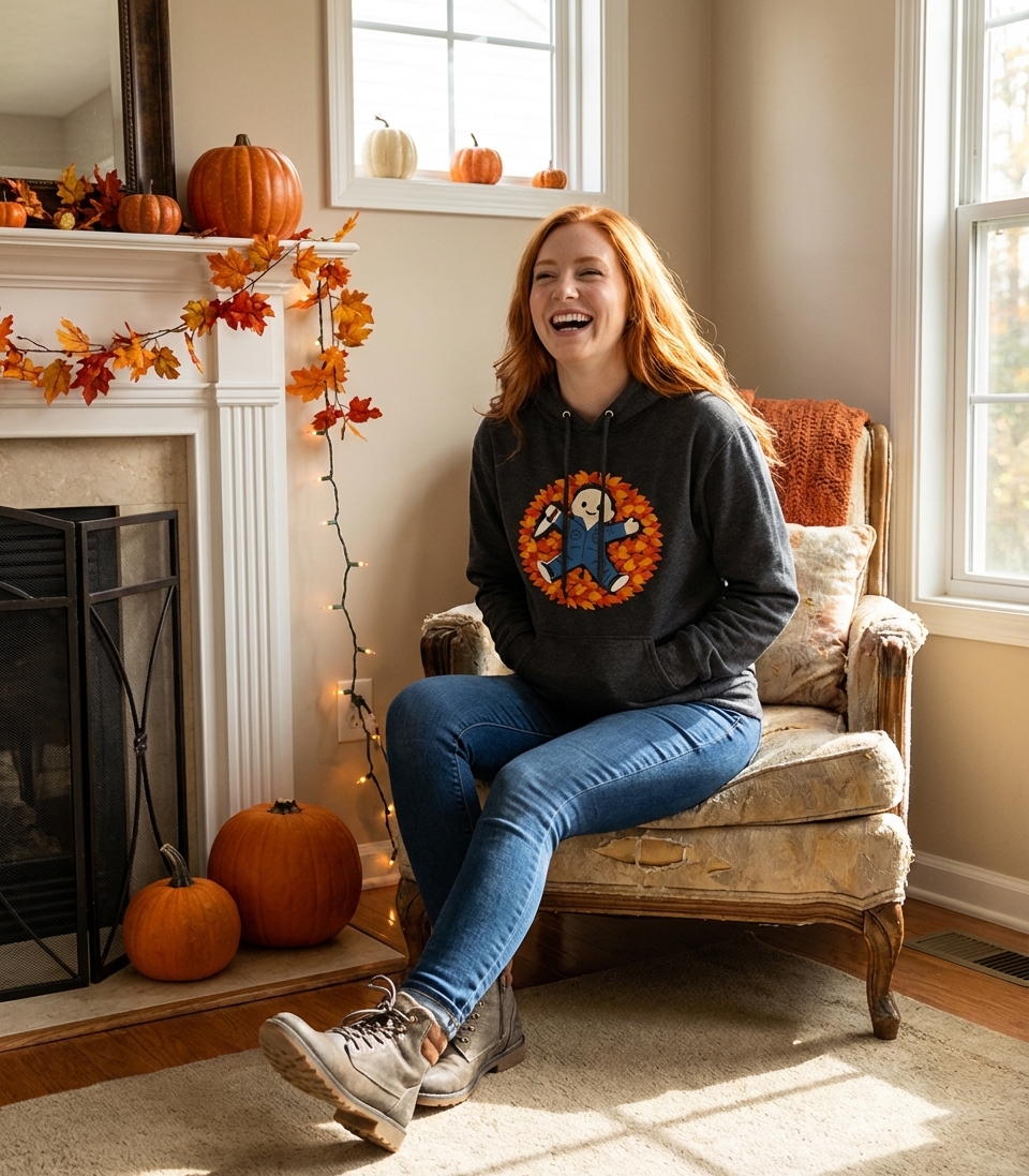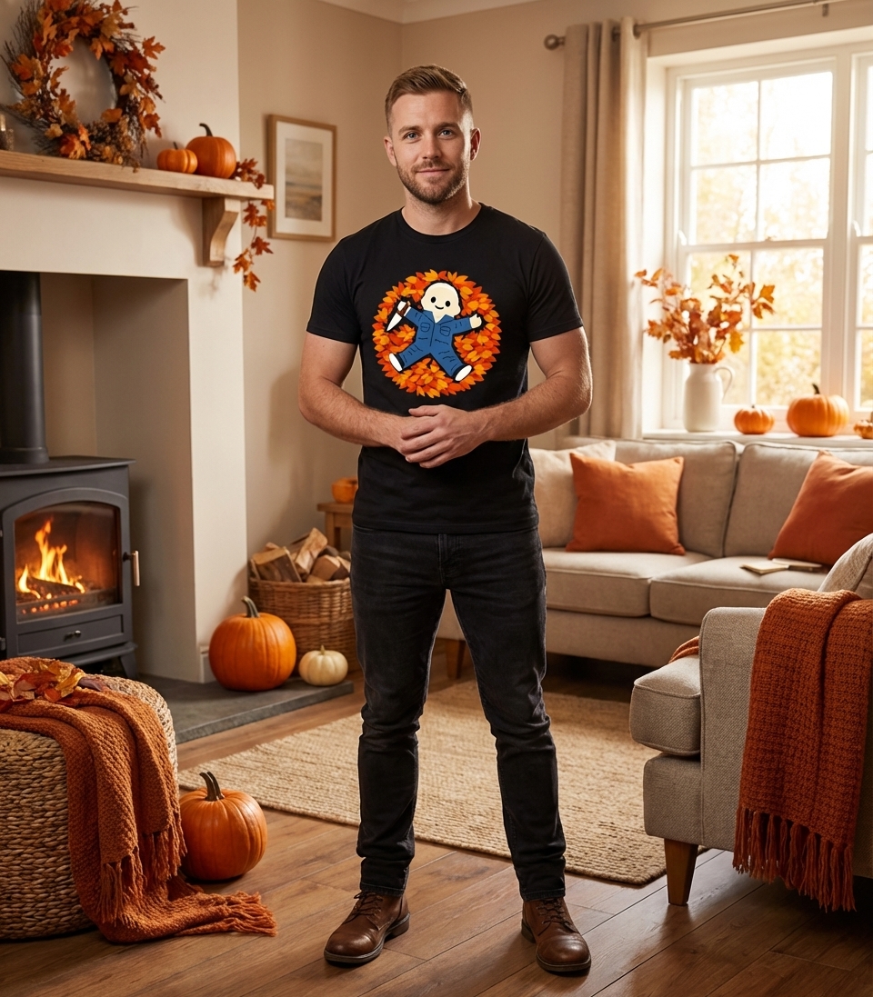 This playful design captures the spirit of horror fans who love the cozy, spooky vibe of autumn and celebrate Halloween with a smile.