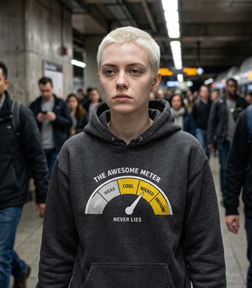 The "Awesome Meter" design captures the self-assured lifestyle of those who proudly embrace their incredible qualities and share a laugh about it.