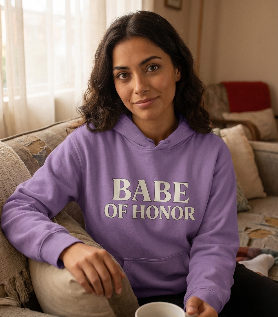 The phrase "Babe of Honor" is a witty and modern twist on the traditional title "Maid of Honor" or "Bridesmaid." It signifies a close friend or family member who holds a special, supportive, and fun-loving role within a wedding party, bringing charm and humor to the celebration.