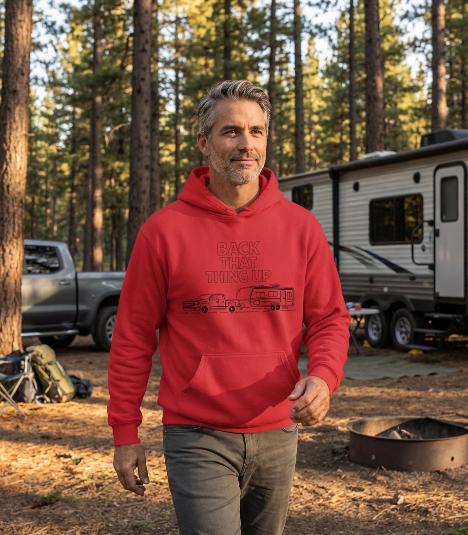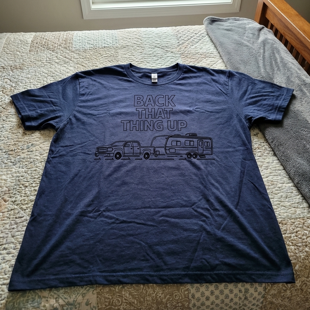 The "Back That Thing Up" phrase captures the lifestyle of passionate RV and camping enthusiasts who spend their days traveling, exploring, and skillfully maneuvering their rigs.