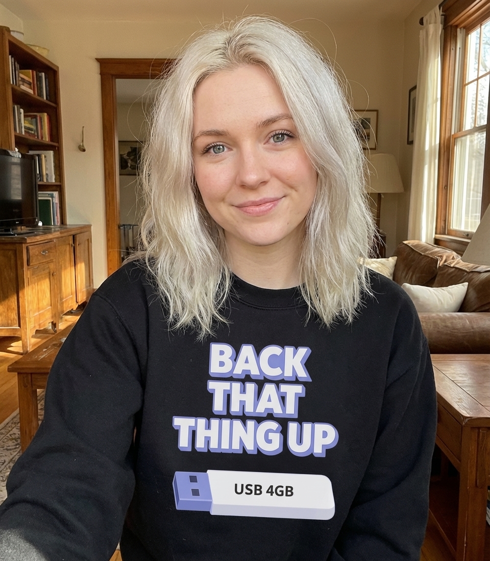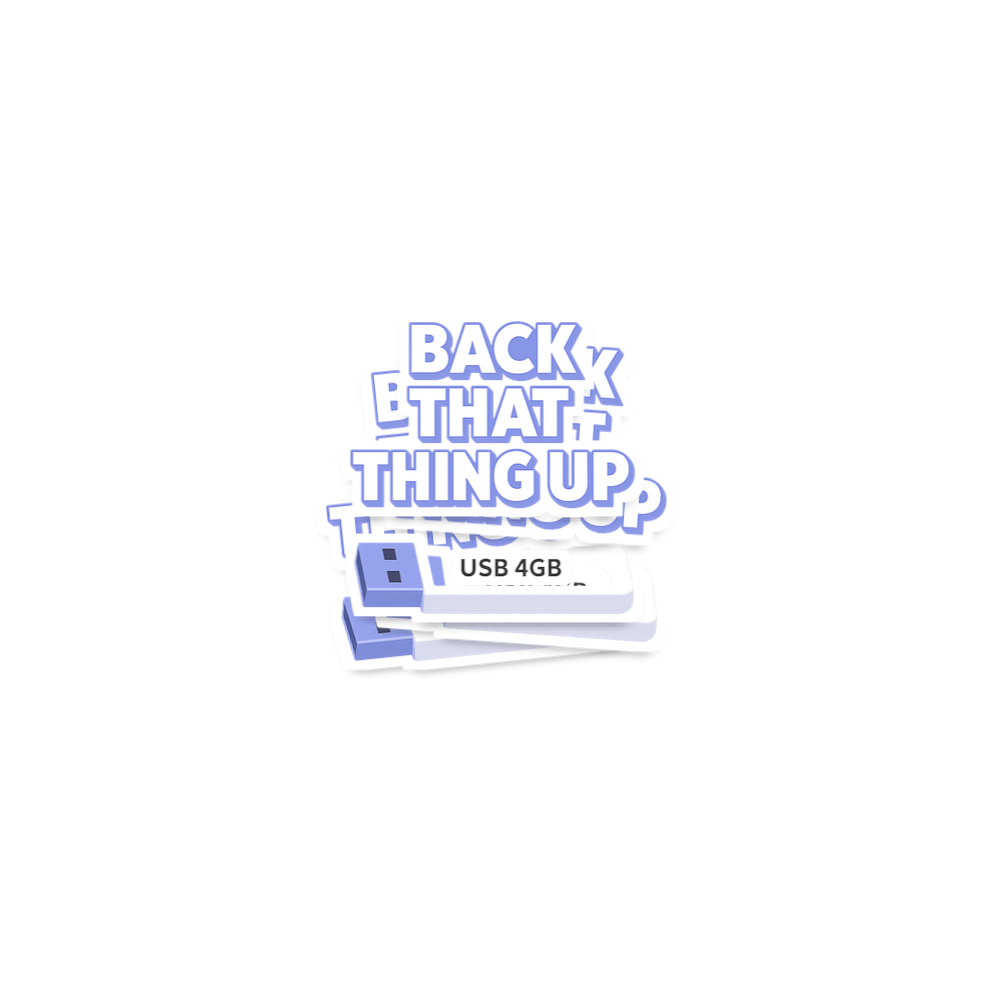The phrase "Back That Thing Up" is famously associated with music and dance, implying a physical action. Here, it’s humorously reinterpreted in the context of technology, urging the crucial task of data backup using a USB drive. This witty double entendre highlights the importance of protecting digital information in a lighthearted way.