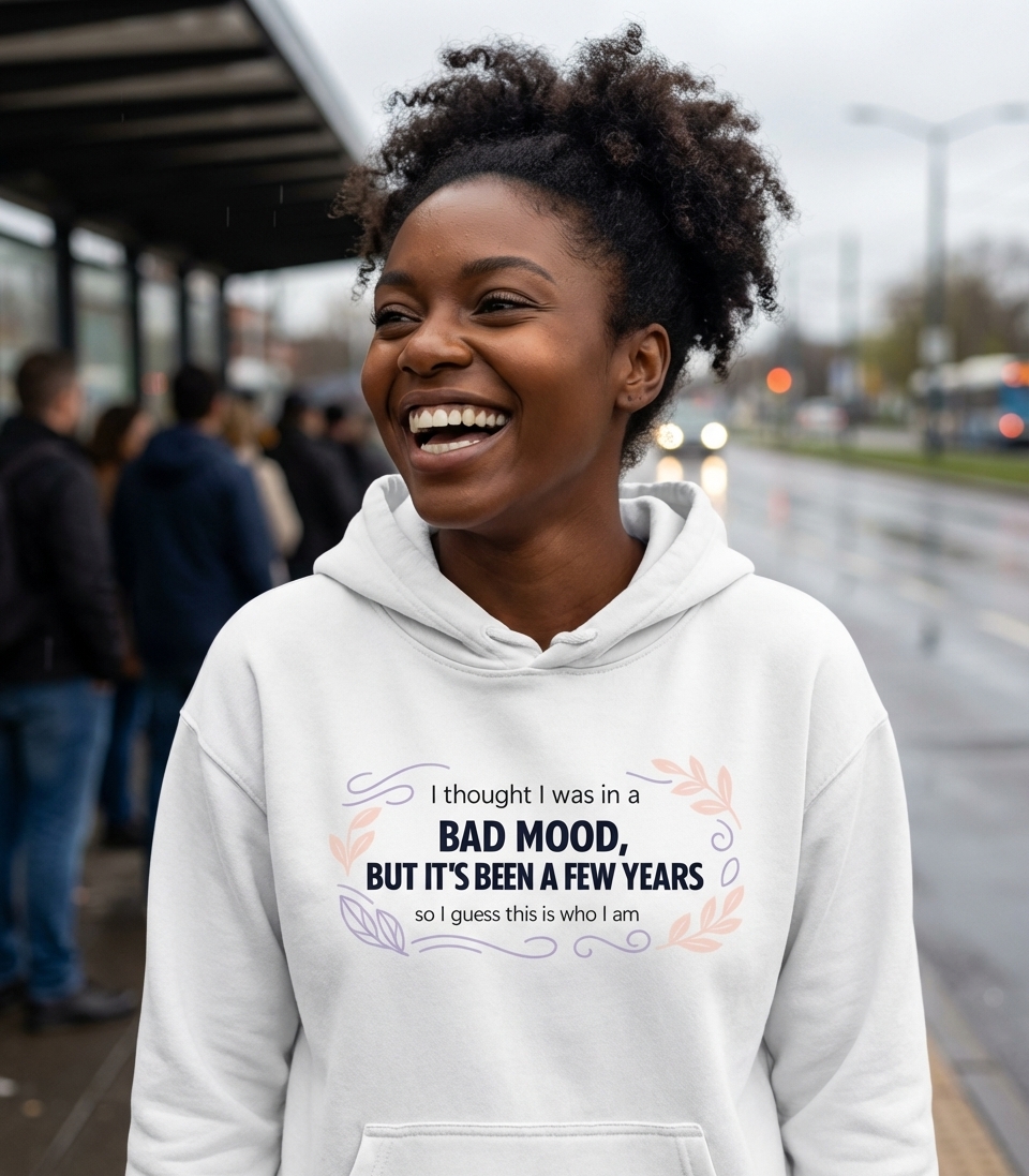 The phrase "I thought I was in a bad mood, but it's been a few years so I guess this is who I am" is a clever take on self-acceptance and dry wit. It implies that what was initially perceived as a temporary state of grumpiness has become a long-term, established aspect of one's character.