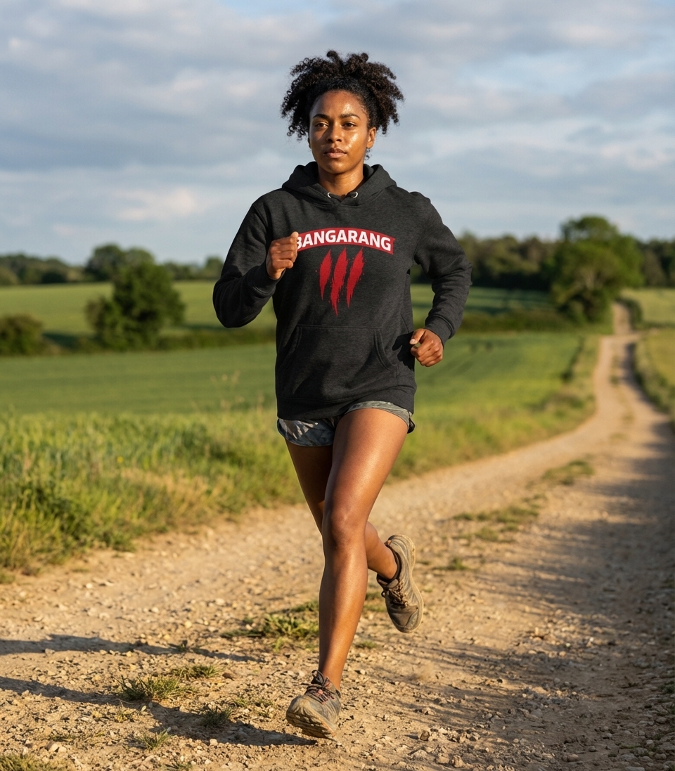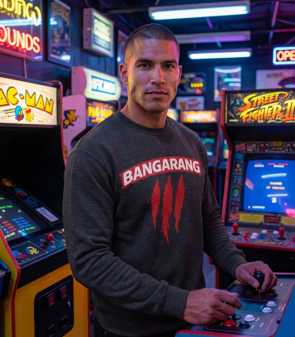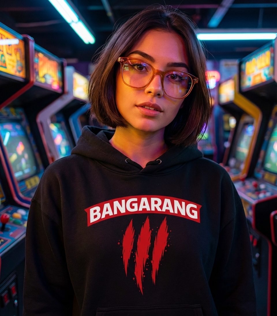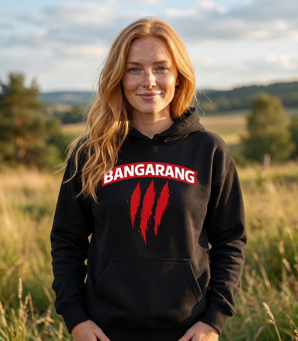 This bold graphic features the iconic battle cry "BANGARANG" set above fierce claw marks. The design is presented in striking red and white on a deep black background, creating a powerful and adventurous aesthetic.