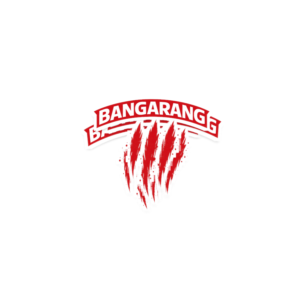 The design features bold, capitalized white text 'BANGARANG' encased in a red curved banner, creating a strong visual focal point. Below, three distressed red claw marks with splatters add a raw, aggressive, and wild mood. The stark contrast of red and white against a black background enhances its dramatic and energetic style.