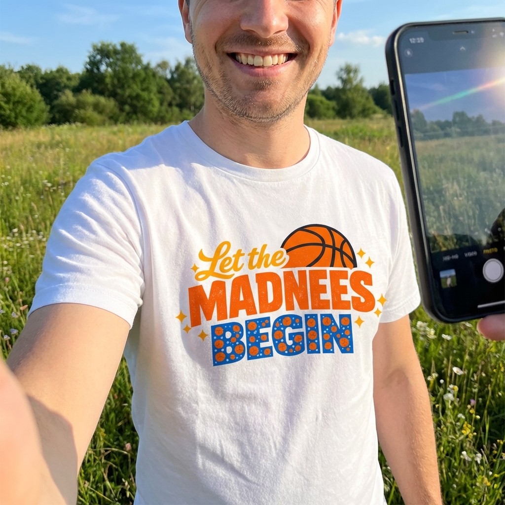 The "Let the Madness Begin" phrase captures the lifestyle of passionate basketball fans who eagerly anticipate the start of tournaments, cheer on their favorite teams, and celebrate every thrilling moment.