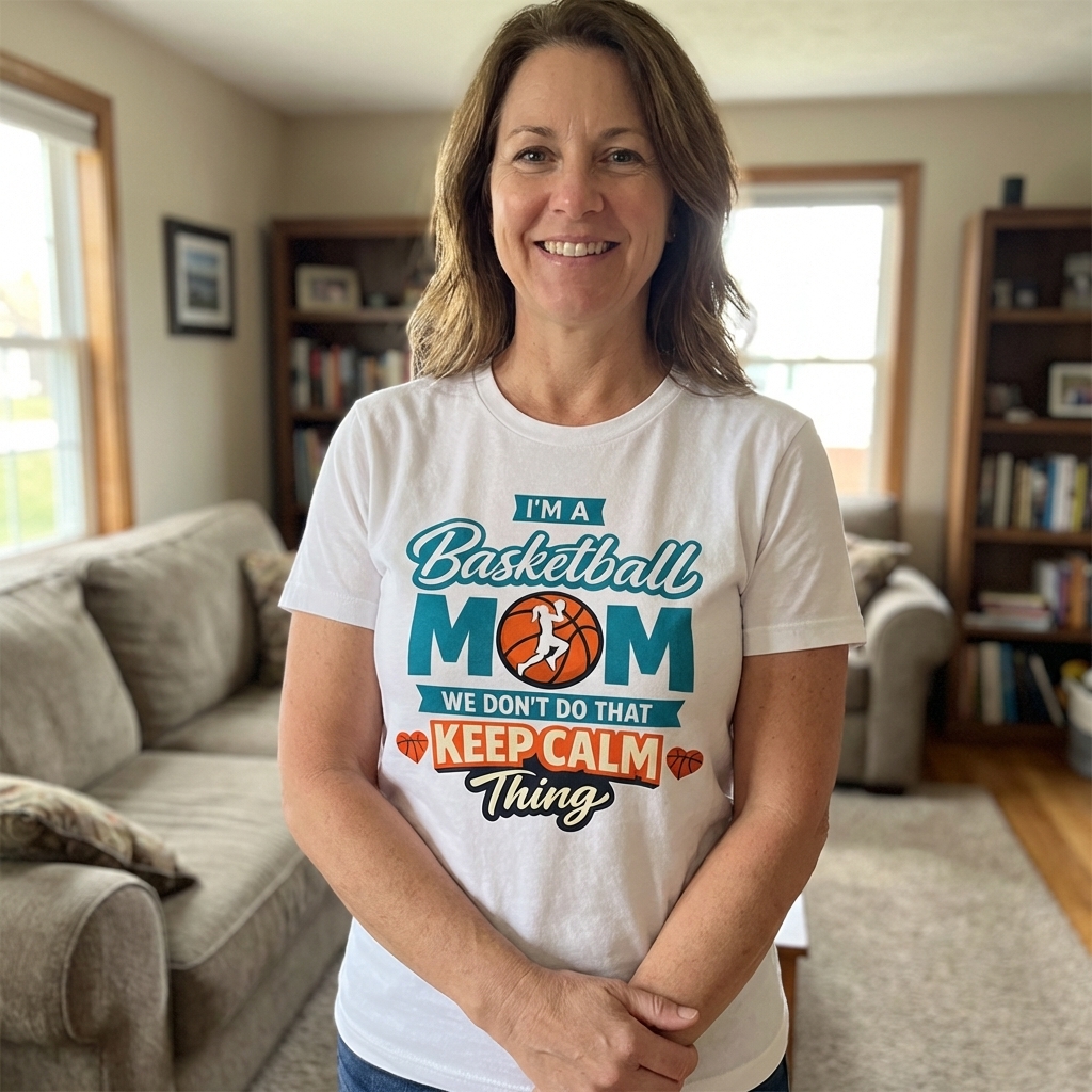 The 'Basketball Mom' phrase captures the lifestyle of passionate mothers who enthusiastically support their athletes, cheer loudly from the sidelines, and live for game day.