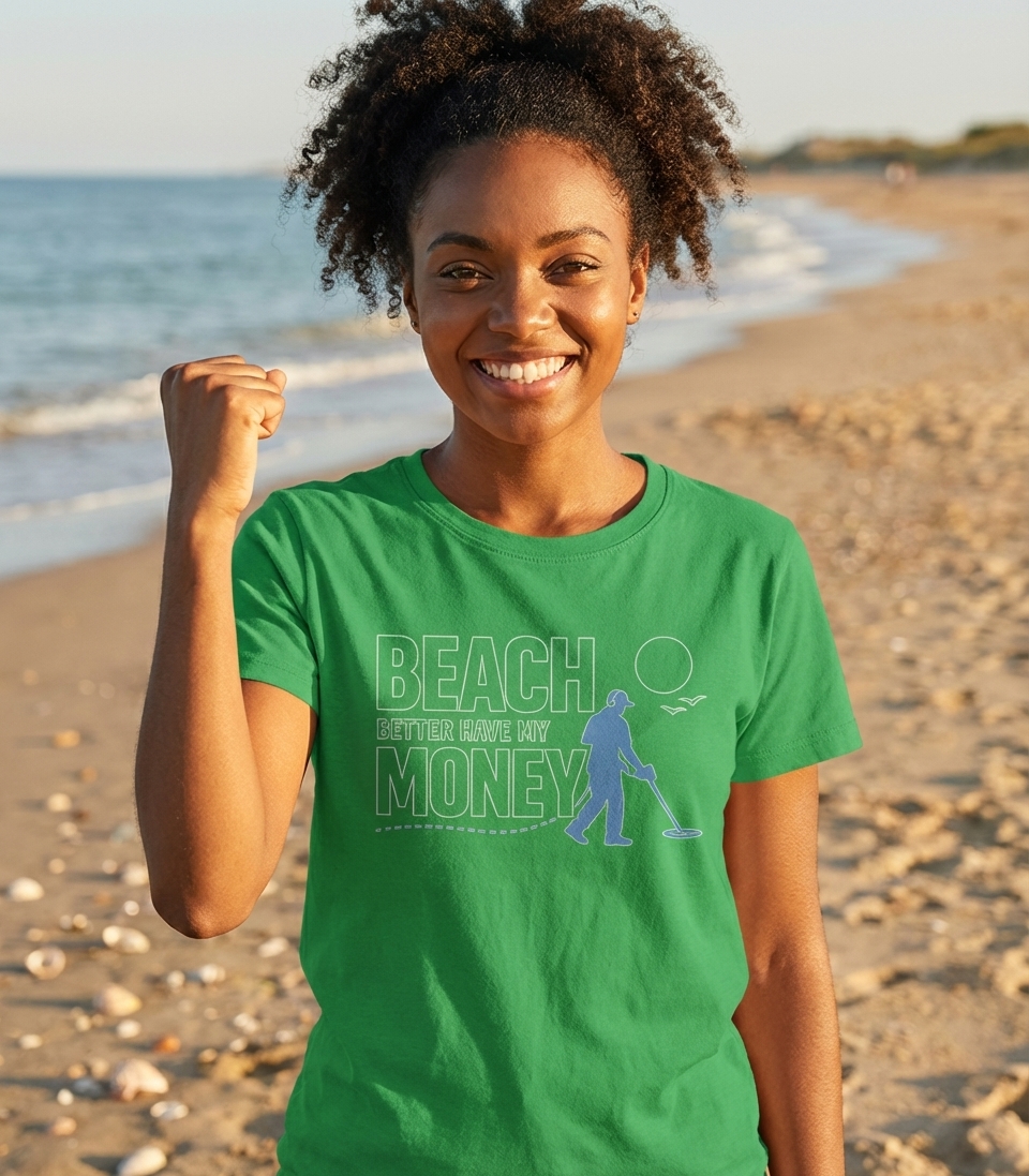 The phrase "Beach Better Have My Money" is a clever and humorous play on a well-known cultural idiom. In the context of metal detecting, it expresses the hopeful expectation and playful demand of finding money or valuable treasures during a beach hunt. It embodies the thrill of the search and the desire for a rewarding discovery.