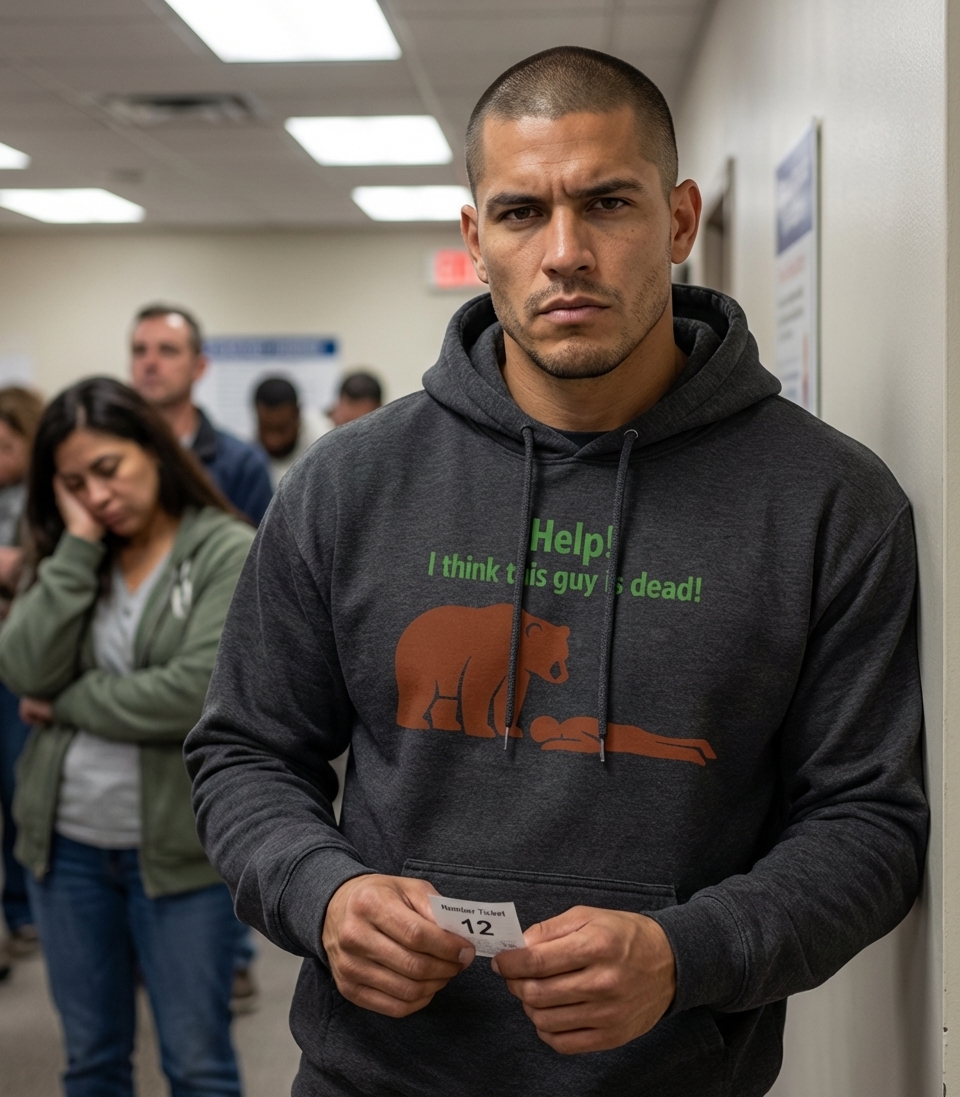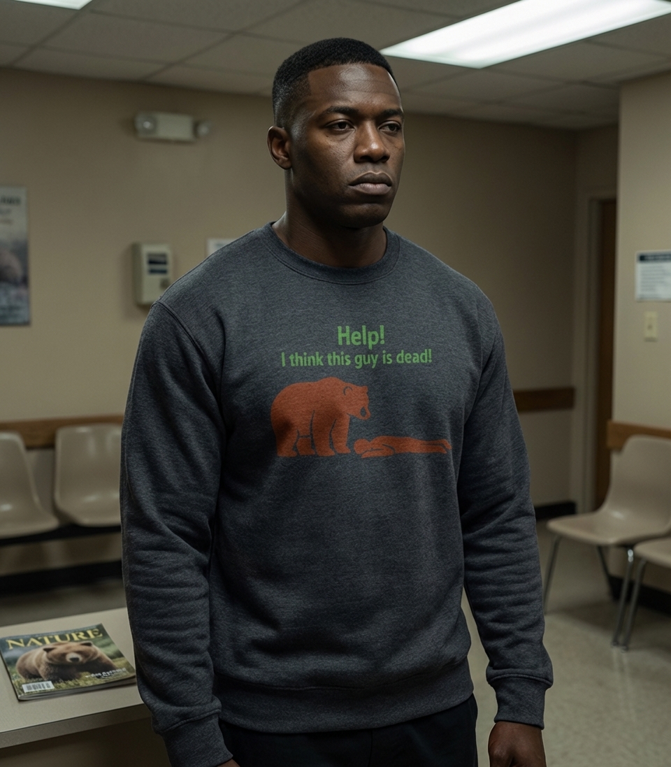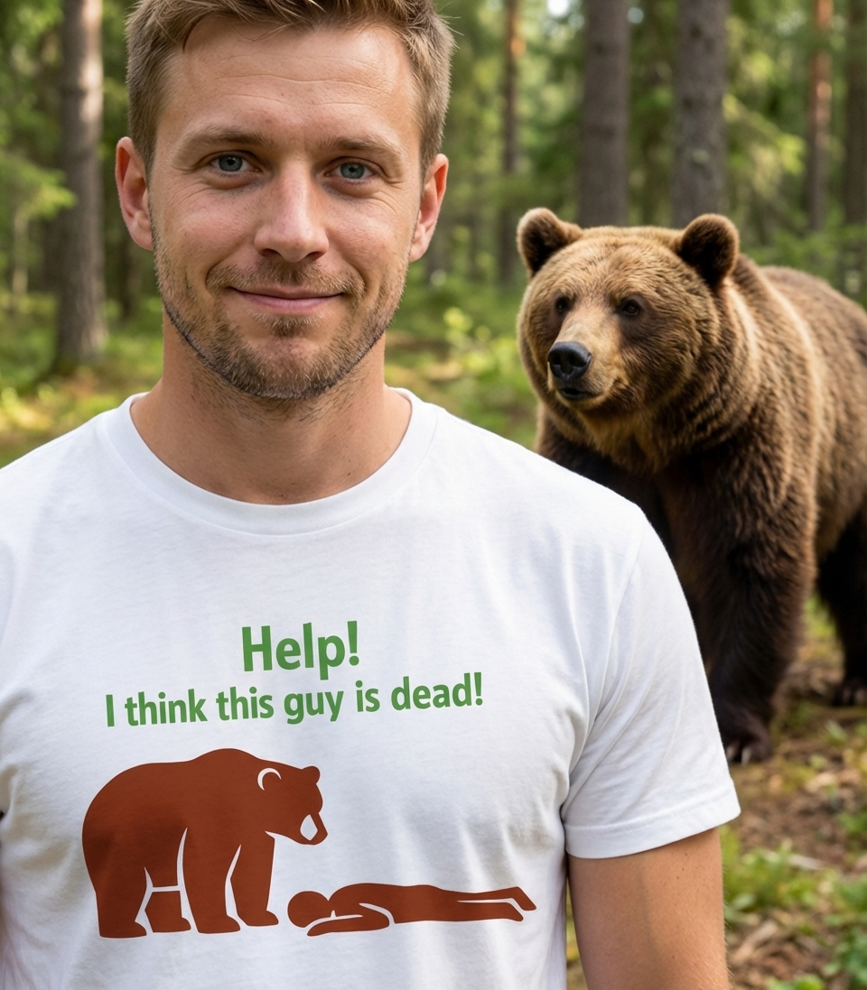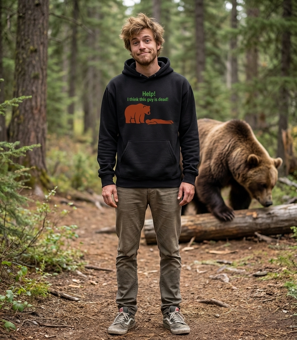 This design captures the ironic moment of a perplexed bear discovering a motionless human, appealing to those who appreciate wilderness and a good laugh.
