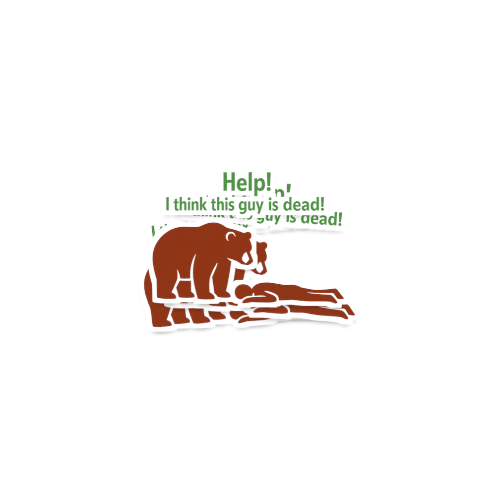 This unique graphic features a cartoon-style brown bear looking down with a puzzled expression at a human figure lying motionless on the ground. The accompanying text, 'Help! I think this guy is dead!', delivers a clever punchline, suggesting the bear's misunderstanding or perhaps a successful 'playing dead' strategy.