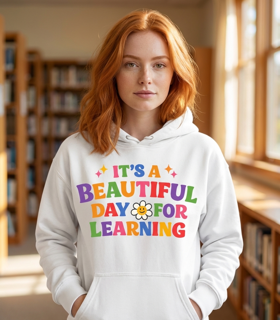 The 'It's a Beautiful Day for Learning' phrase captures the optimistic spirit of educators and students eager to engage, discover, and grow.