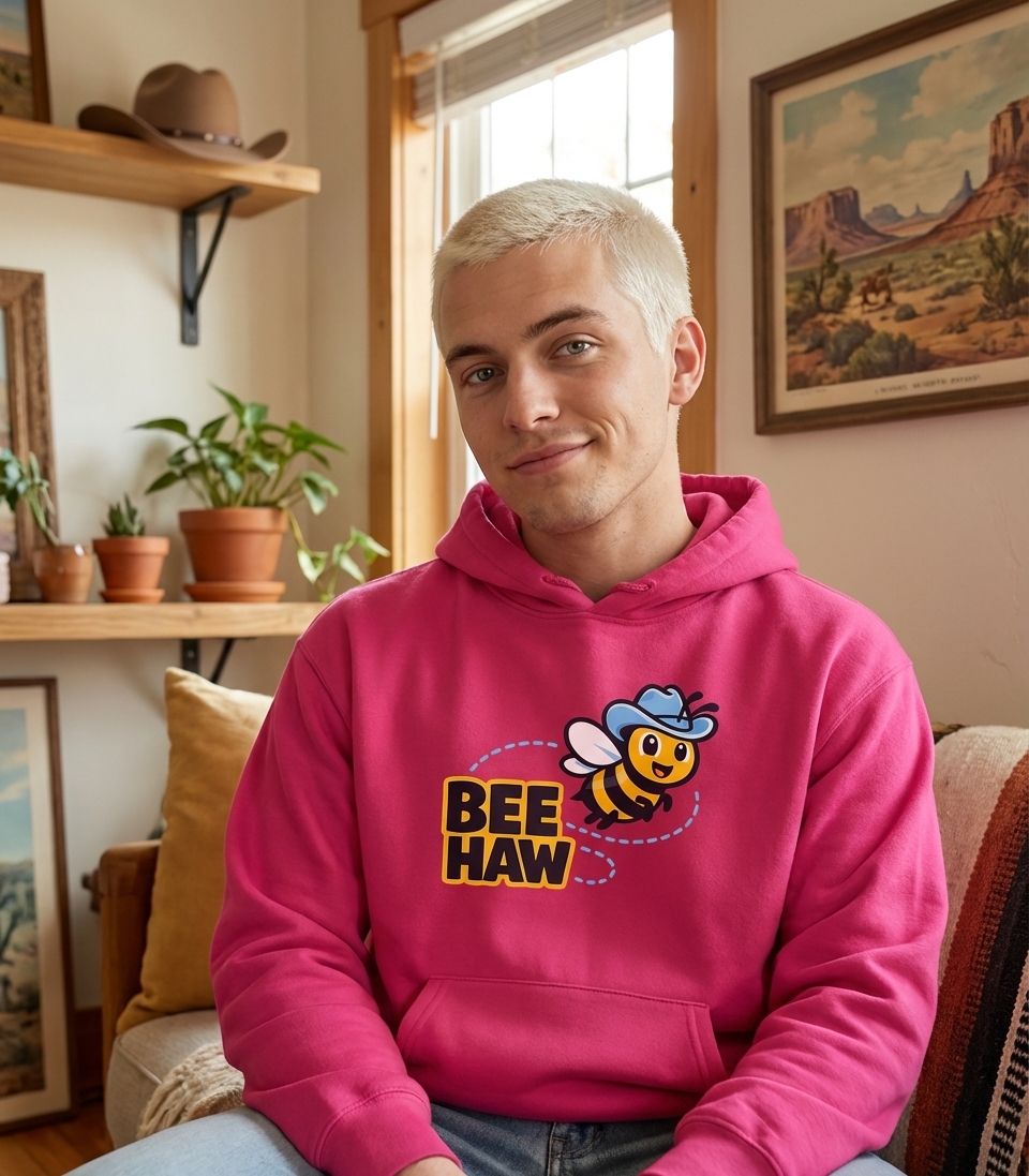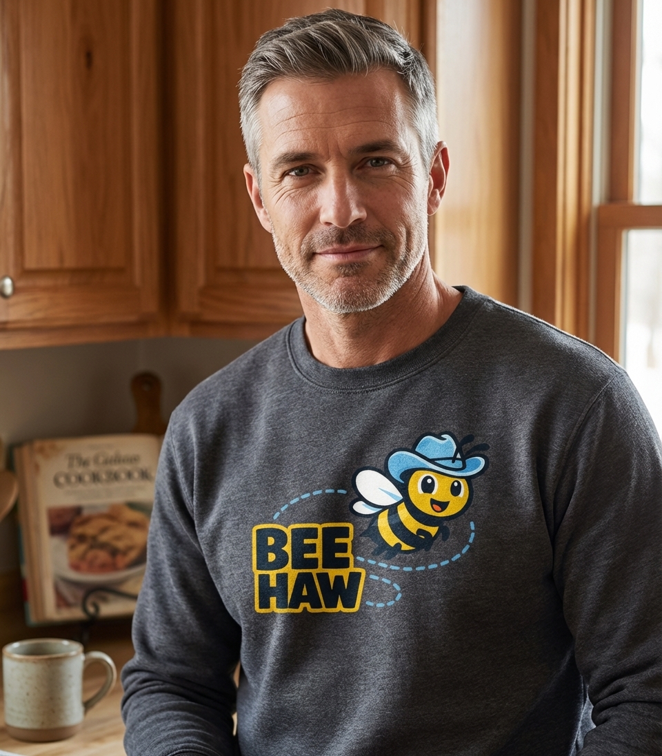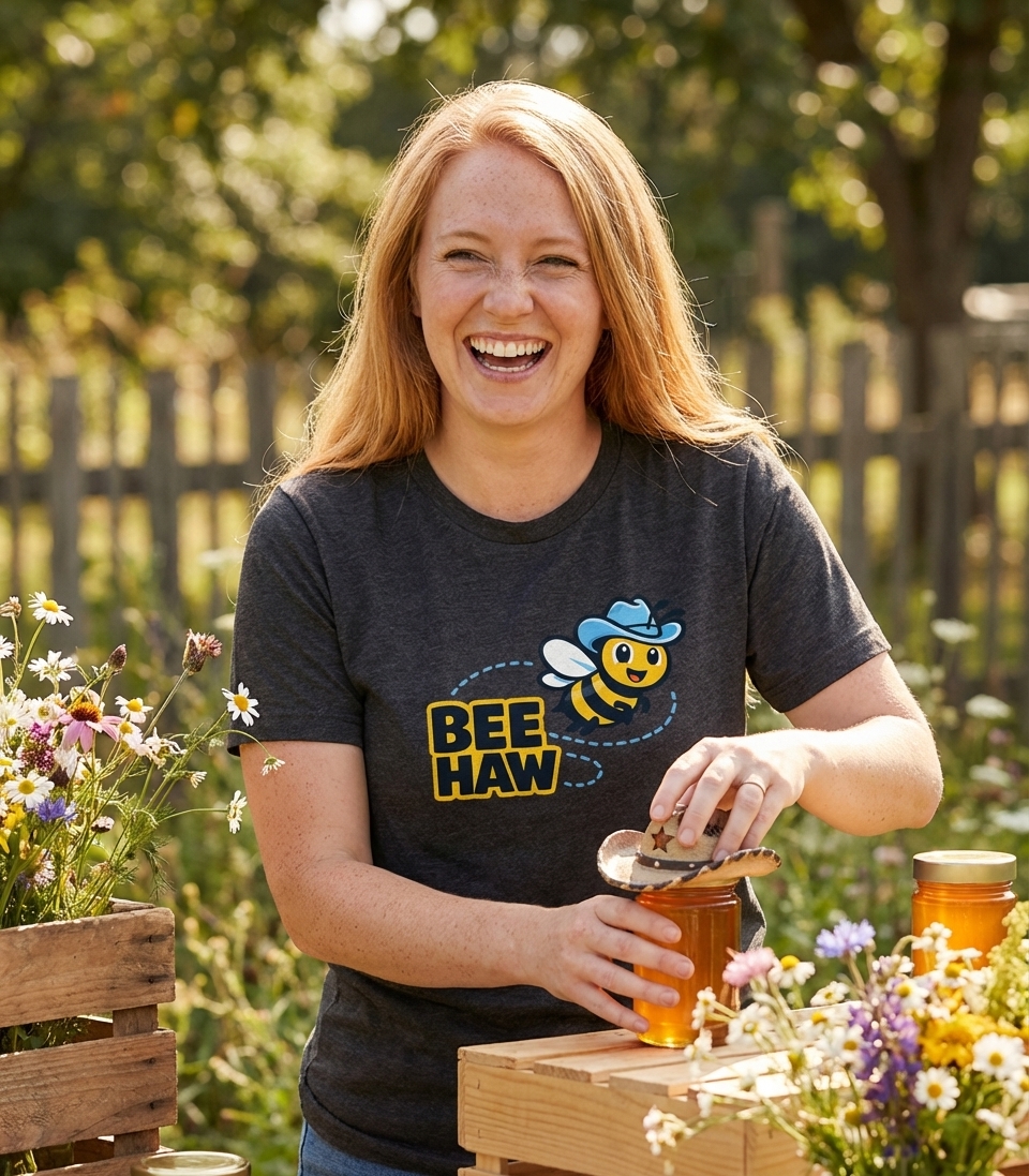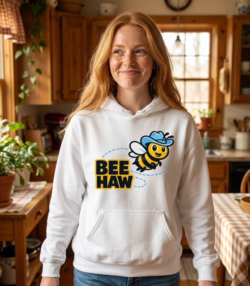 The phrase "BEE HAW" is a delightful pun on the classic cowboy exclamation "Yee Haw." It merges the sound of a bee with the enthusiastic cry of the Wild West. This playful twist evokes a sense of humor and appreciation for wordplay.