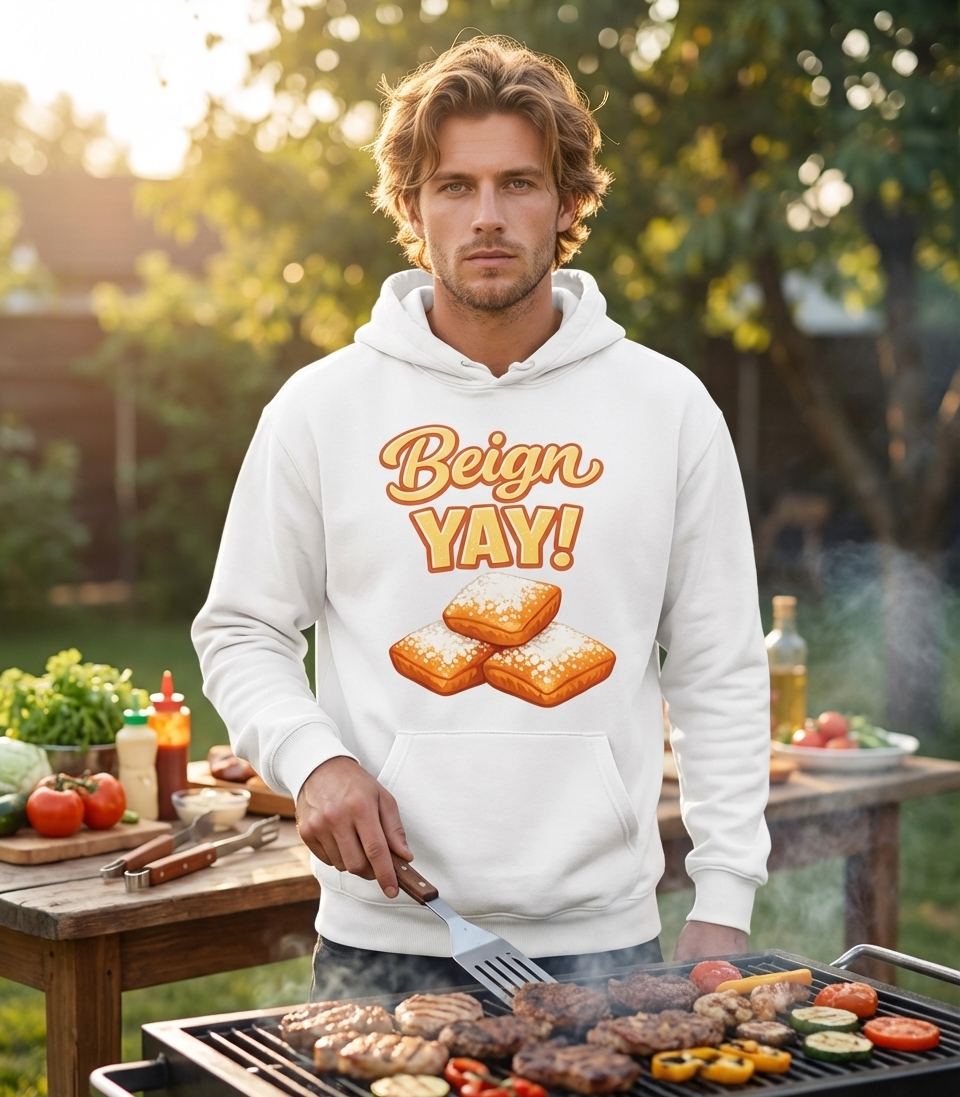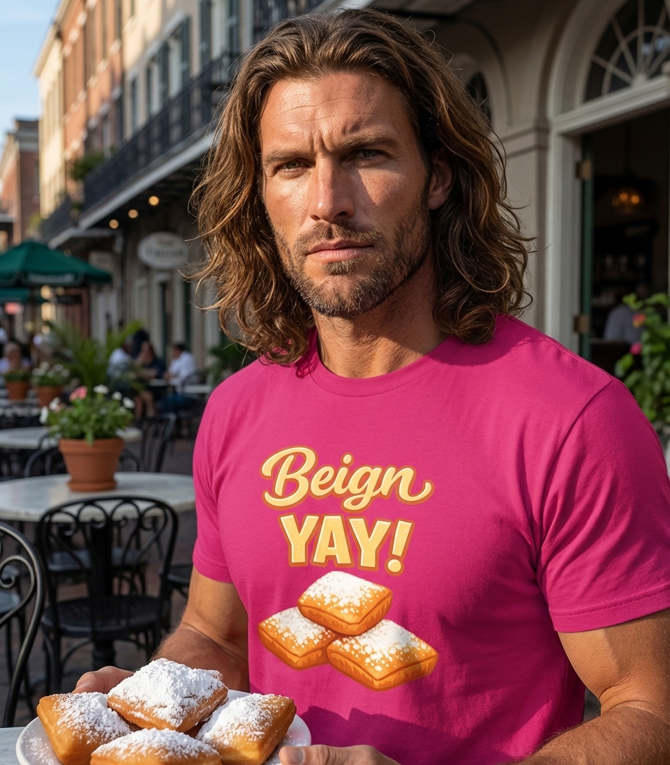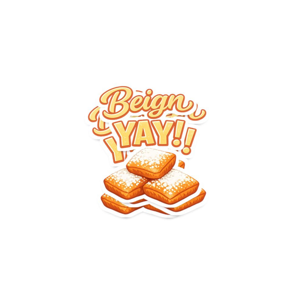 The phrase "Beign YAY!" is a fun, lighthearted pun on "beignet," an iconic New Orleans confection. It expresses enthusiasm and joy for these delicious, powdered sugar-covered treats, popular in cafes and bakeries.