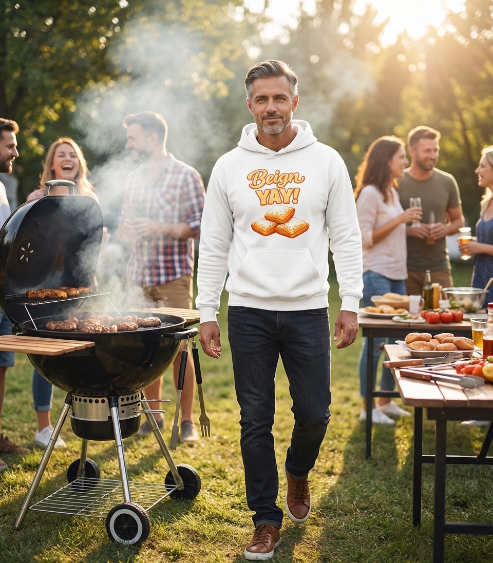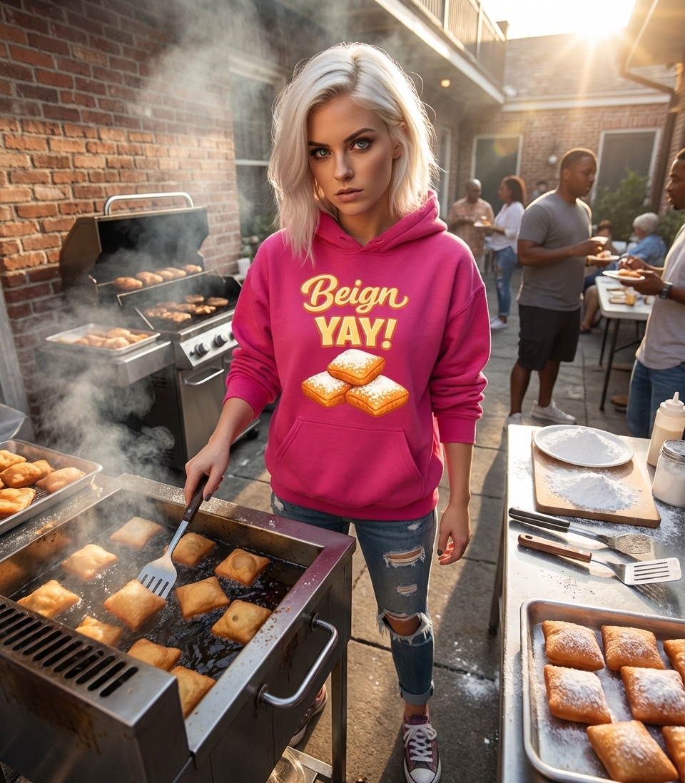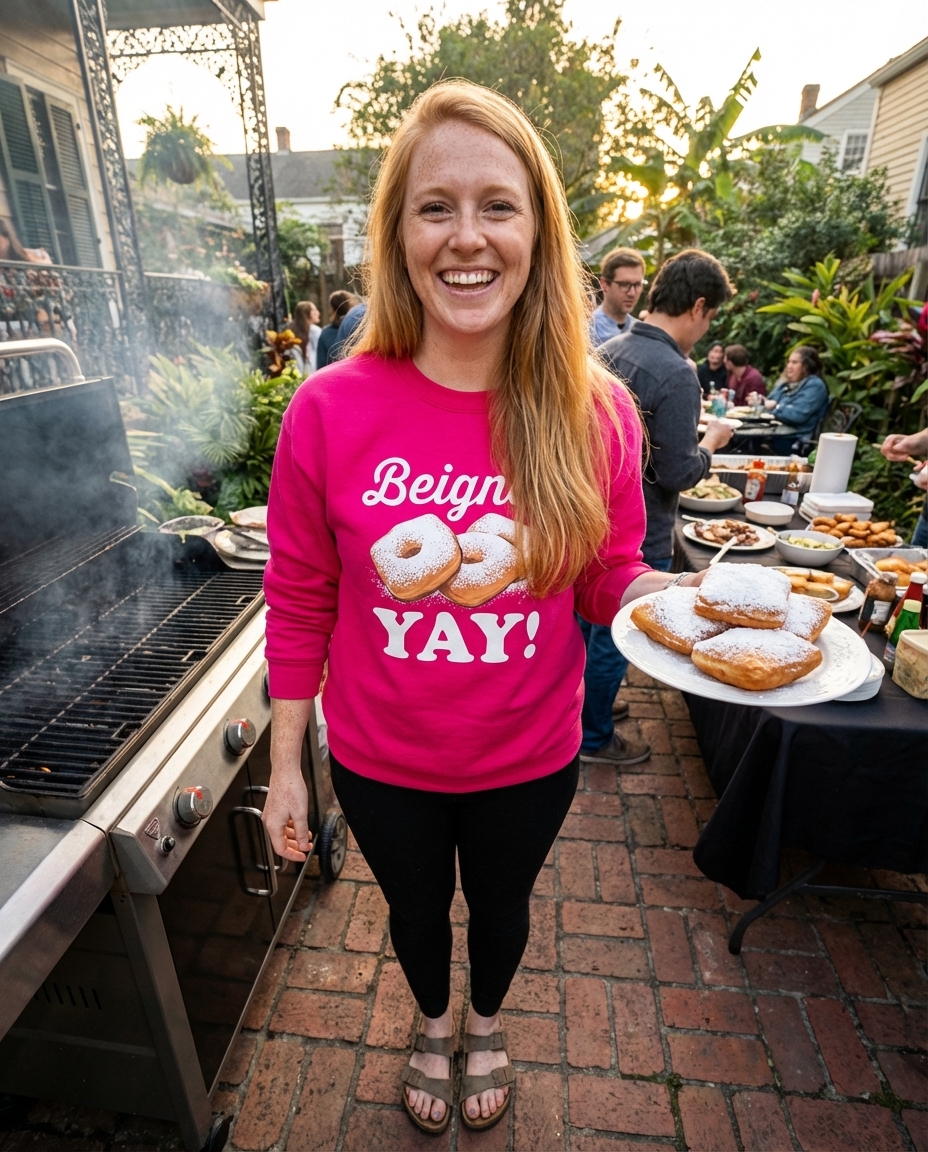 The phrase "Beign YAY!" is a fun, lighthearted pun on "beignet," an iconic New Orleans confection. It expresses enthusiasm and joy for these delicious, powdered sugar-covered treats, popular in cafes and bakeries.