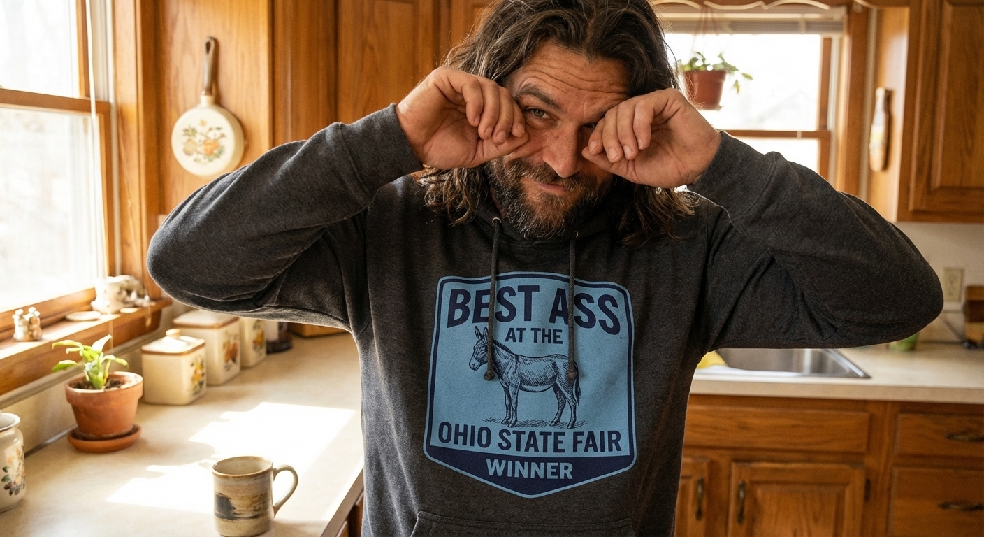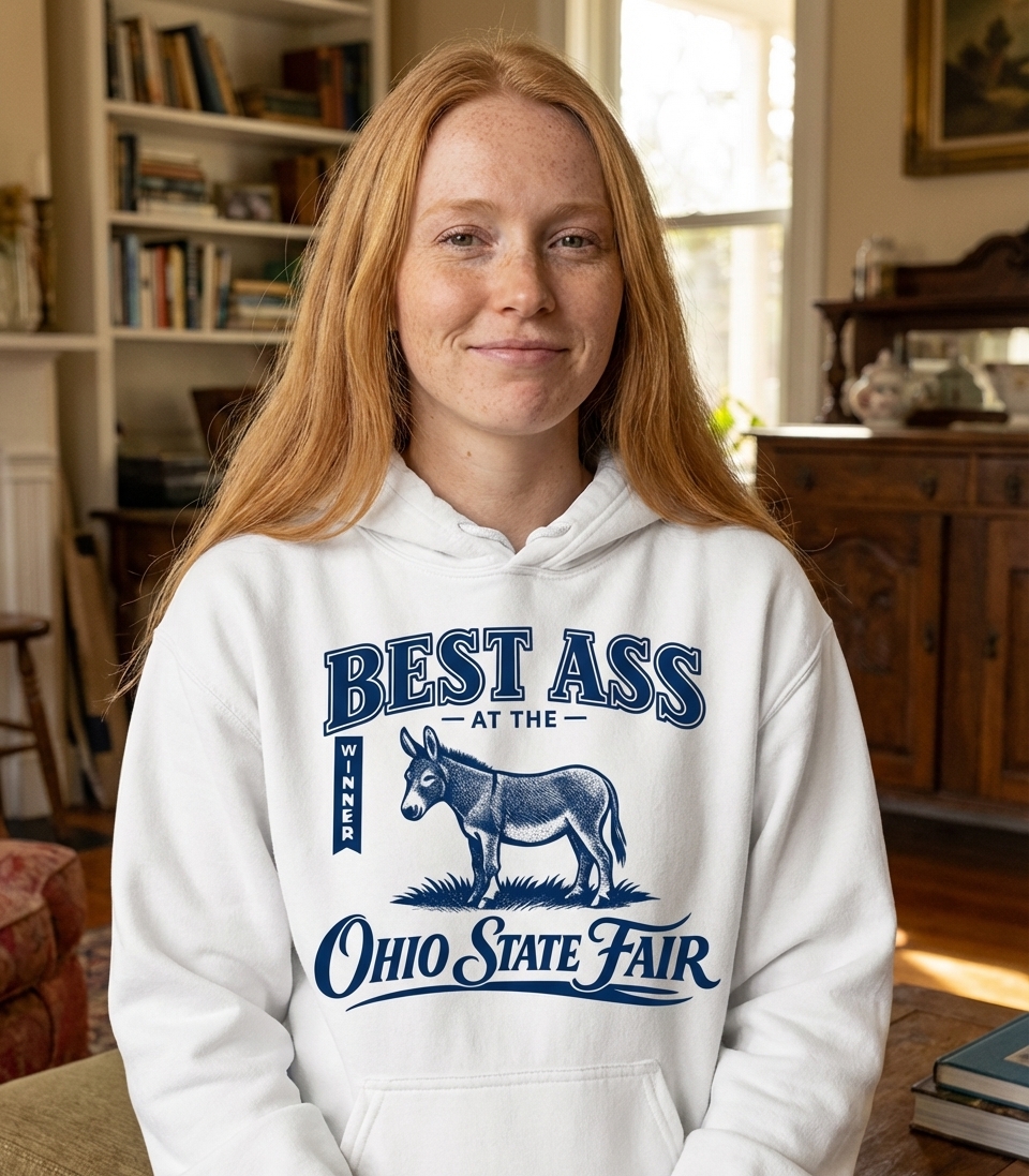 The phrase "Best Ass at the Ohio State Fair" is a classic pun, using the common term for a donkey in a playful, double-entendre context. It implies a sense of winning or being exceptional in a fun and memorable way, connecting to the excitement of local agricultural events.