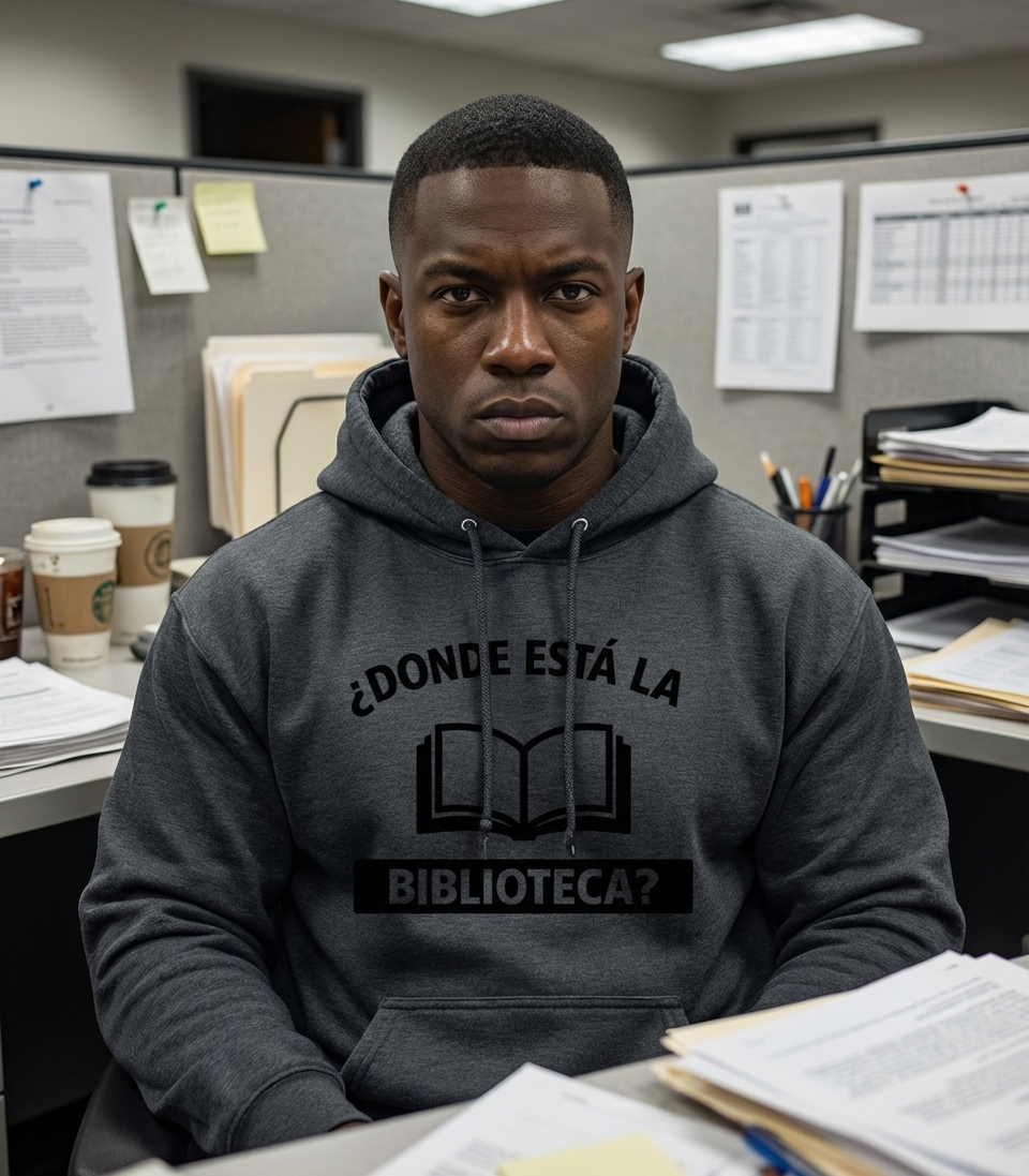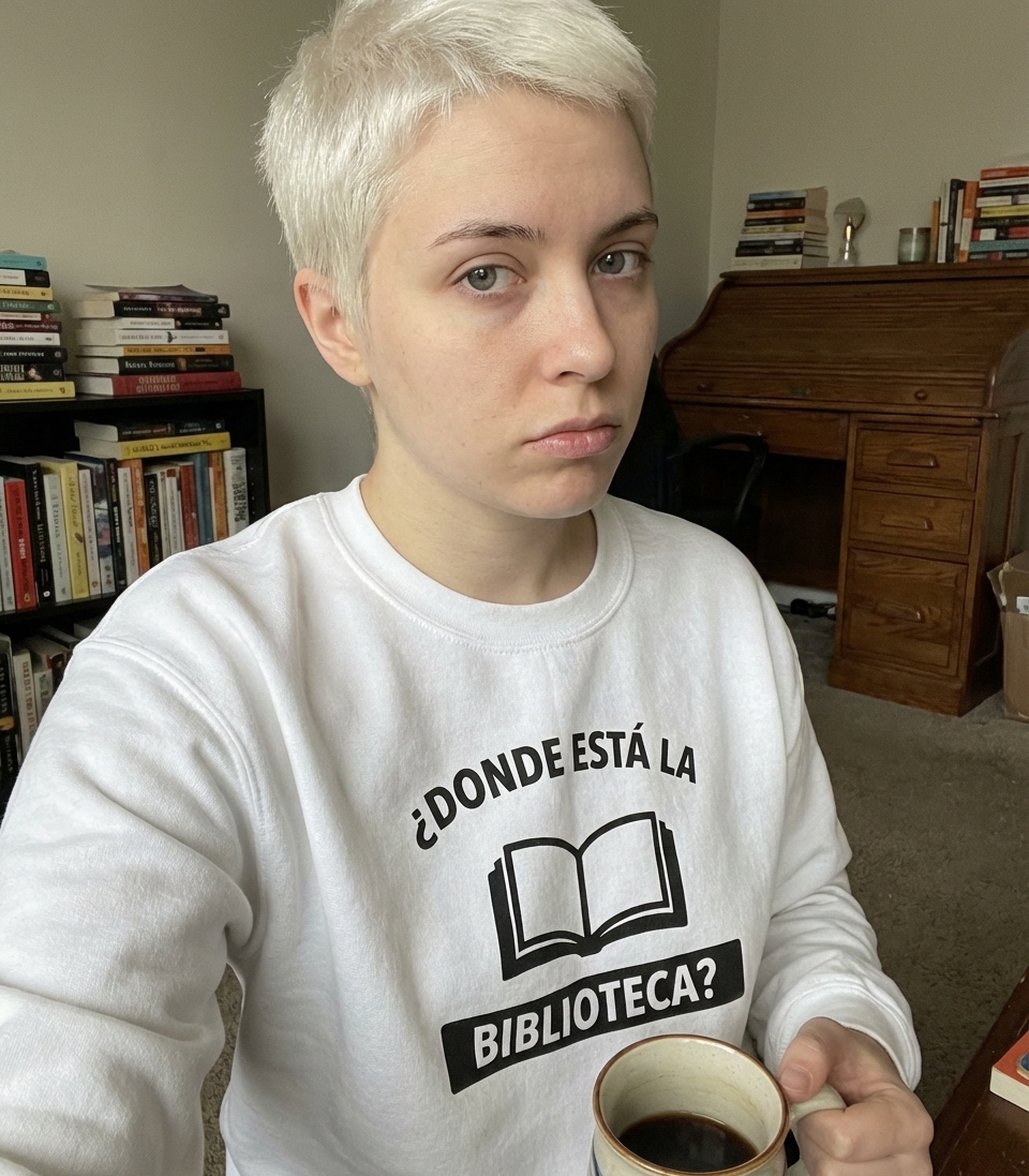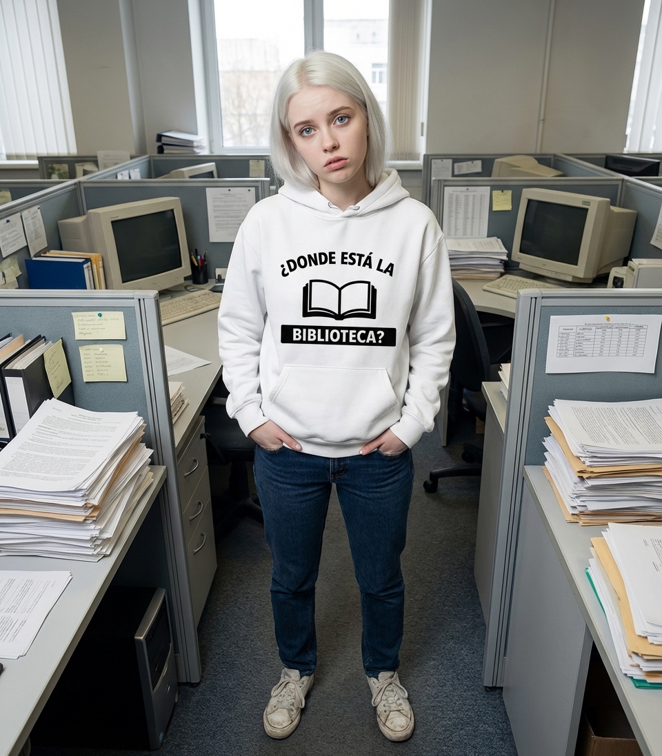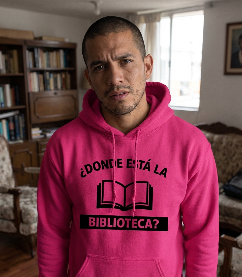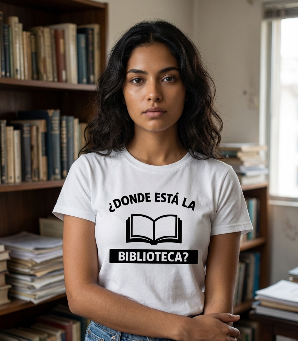 The "BIBLIOTECA?" phrase captures the lifestyle of passionate book lovers who appreciate quiet spaces, learning, and the joy of reading.