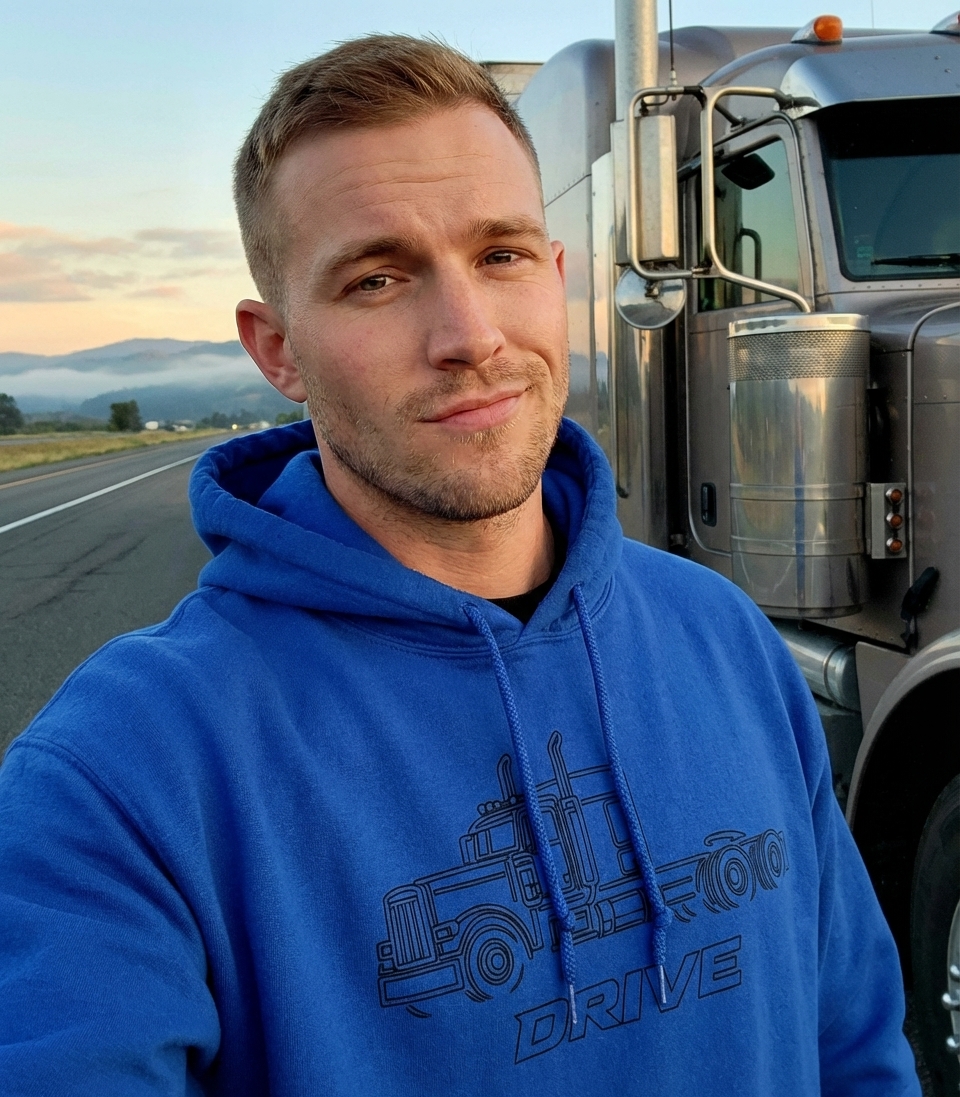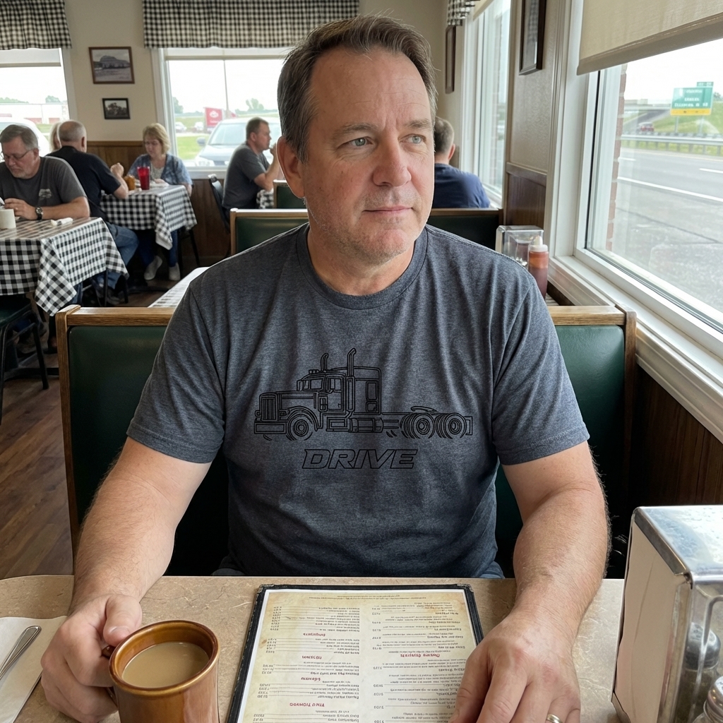 The "DRIVE" design captures the lifestyle of passionate truck drivers who spend their days hauling freight, exploring highways, and living life on the open road.