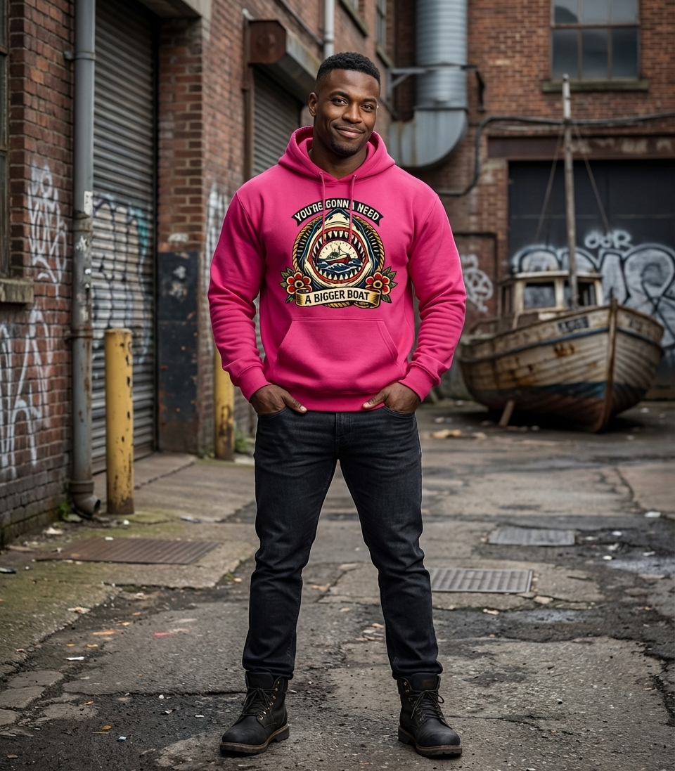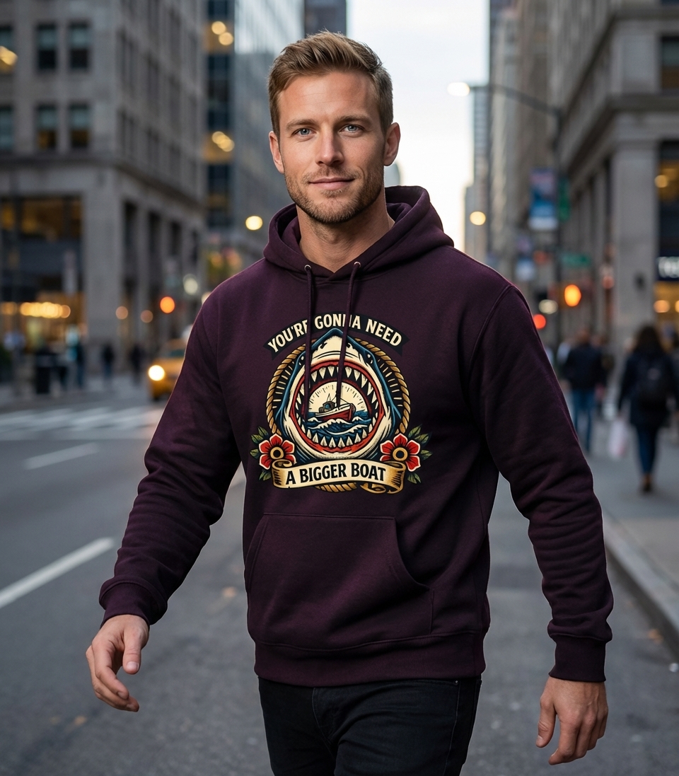 The "You're Gonna Need A Bigger Boat" phrase captures the adventurous spirit of passionate boaters and anglers who spend their days navigating waters, reeling in catches, and facing the unknown depths.