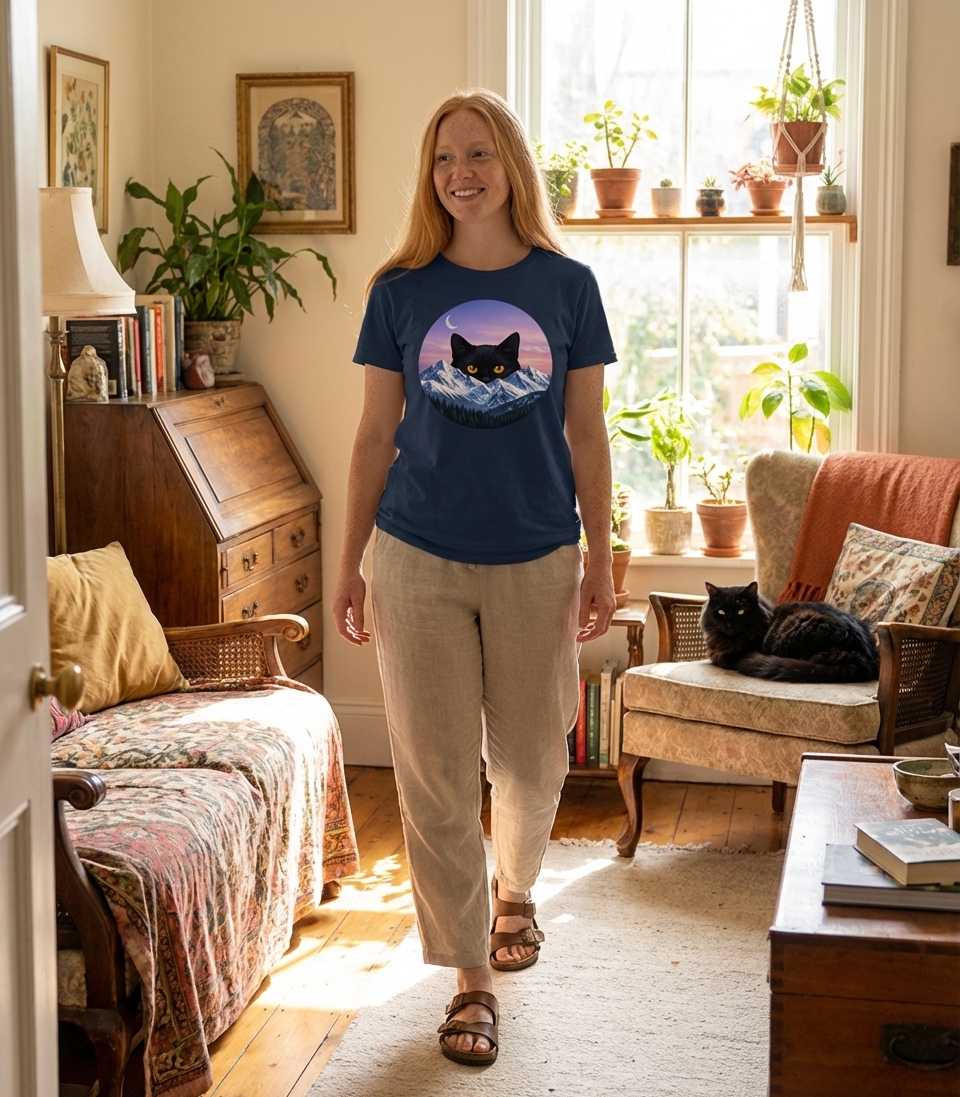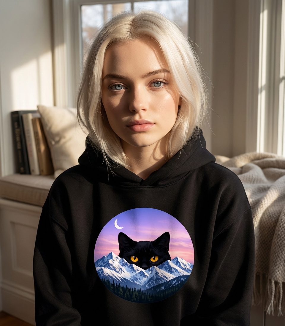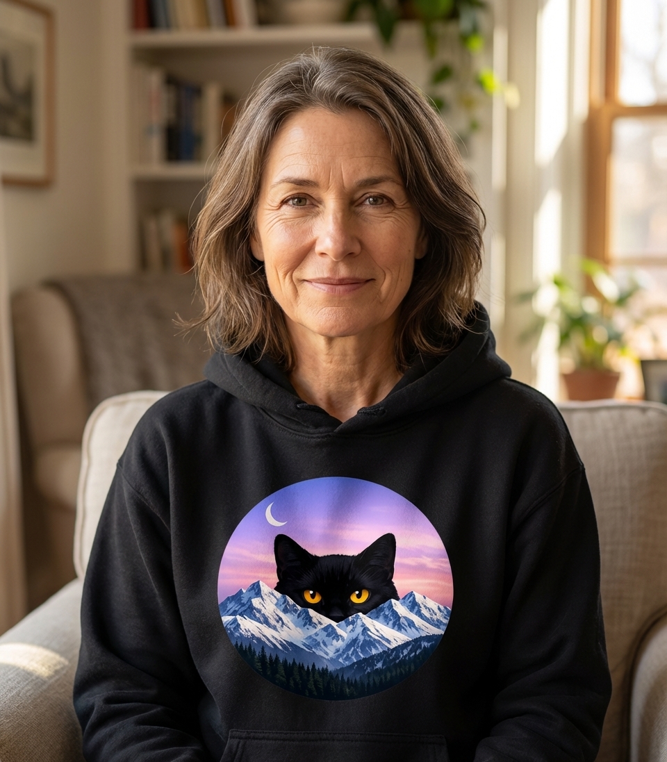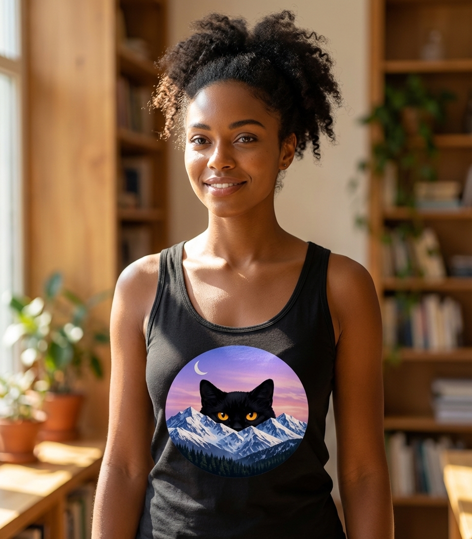 The mystical mountain cat design captures the adventurous spirit of cat lovers who enjoy majestic landscapes, quiet moments, and the allure of the wild.